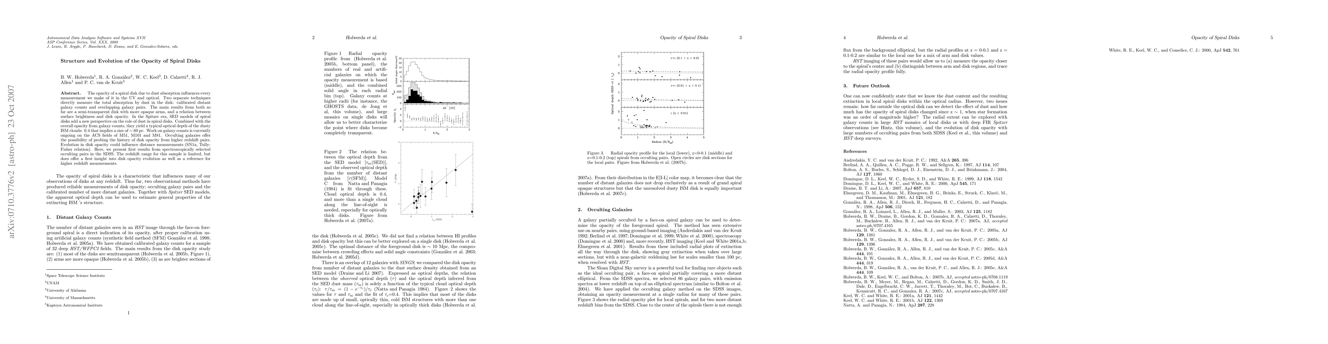 The opacity of a spiral disk due to dust absorption influences every measurement we make of it in the UV and optical. Two separate techniques directly measure the total absorption by dust in the disk: calibrated distant galaxy counts and overlapping galaxy pairs. The main results from both so far are a semi-transparent disk with more opaque arms, and a relation between surface brightness and disk opacity. In the Spitzer era, SED models of spiral disks add a new perspective on the role of dust in spiral disks. Combined with the overall opacity from galaxy counts, they yield a typical optical depth of the dusty ISM clouds: 0.4 that implies a size of ~60 pc. Work on galaxy counts is currently ongoing on the ACS fields of M51, M101 and M81. Occulting galaxies offer the possibility of probing the history of disk opacity from higher redshift pairs. Evolution in disk opacity could influence distance measurements (SN1a, Tully-Fisher relation). Here, we present first results from spectroscopically selected occulting pairs in the SDSS. The redshift range for this sample is limited, but does offer a first insight into disk opacity evolution as well as a reference for higher redshift measurements.