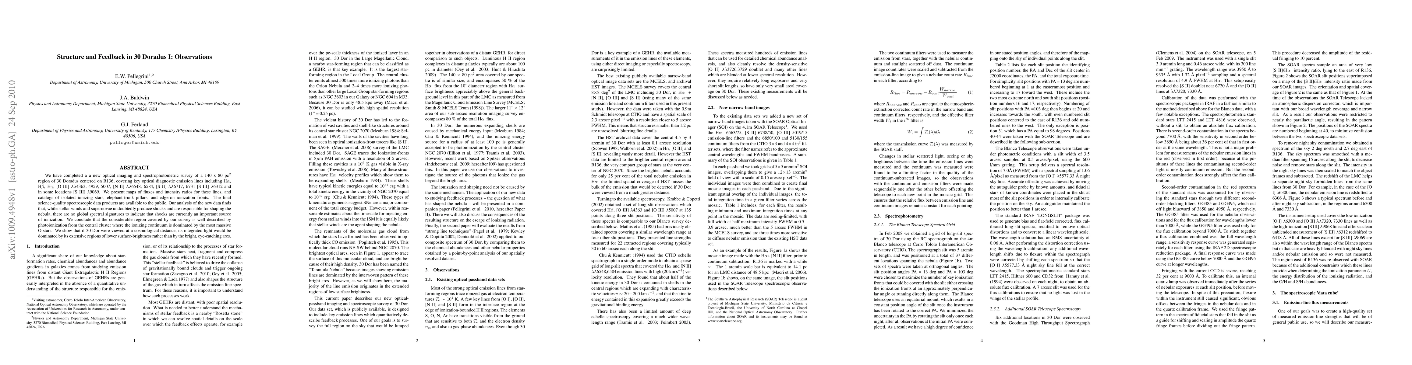 A new survey of 30 Doradus reveals that photoionization from massive O stars dominates the nebula's ionization, with no evidence for global shock signatures. The study provides detailed maps and catalogs of the nebula's structure and features.
