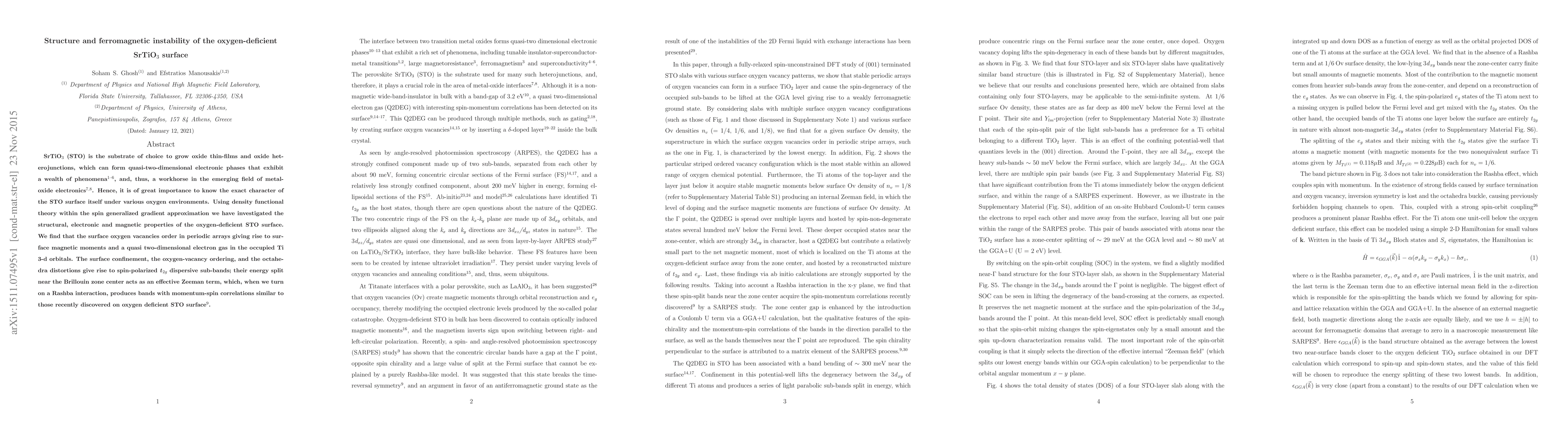 This study investigates the structural, electronic, and magnetic properties of oxygen-deficient SrTiO$_3$ surfaces using density functional theory. The research reveals that oxygen vacancies form periodic arrays, leading to surface magnetic moments and a quasi-two-dimensional electron gas, with spin-polarized $t_{2g}$ sub-bands exhibiting momentum-spin correlations akin to those observed in recent studies.