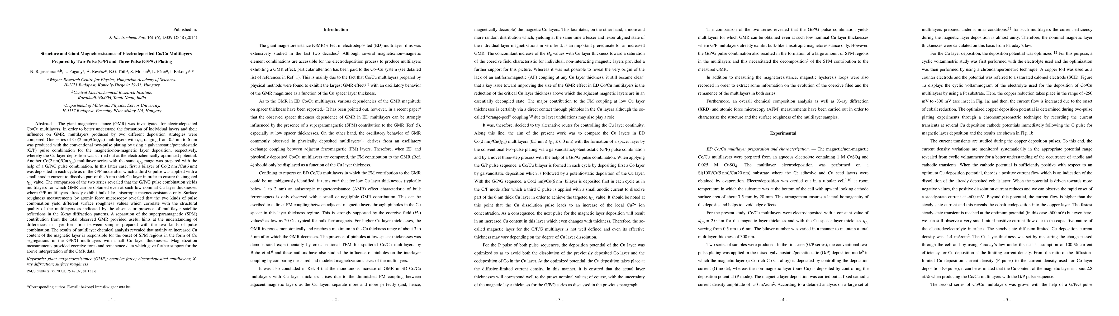 The giant magnetoresistance (GMR) was investigated for electrodeposited Co/Cu multilayers. In order to better understand the formation of individual layers and their influence on GMR, multilayers produced by two different deposition strategies were compared. One series of Co(2 nm)/Cu(tCu) multilayers with tCu ranging from 0.5 nm to 6 nm was produced with the conventional two-pulse plating by using a galvanostatic/potentiostatic (G/P) pulse combination for the magnetic/non-magnetic layer deposition, respectively, whereby the Cu layer deposition was carried out at the electrochemically optimized potential. Another Co(2 nm)/Cu(tCu) multilayer series with the same tCu range was prepared with the help of a G/P/G pulse combination. In this latter case, first a bilayer of Co(2 nm)/Cu(6 nm) was deposited in each cycle as in the G/P mode after which a third G pulse was applied with a small anodic current to dissolve part of the 6 nm thick Cu layer in order to ensure the targeted tCu value. The comparison of the two series revealed that the G/P/G pulse combination yields multilayers for which GMR can be obtained even at such low nominal Cu layer thicknesses where G/P multilayers already exhibit bulk-like anisotropic magnetoresistance only. Surface roughness measurements by atomic force microscopy revealed that the two kinds of pulse combination yield different surface roughness values which correlate with the structural quality of the multilayers as indicated by the absence or presence of multilayer satellite reflections in the X-ray diffraction patterns. The results of multilayer chemical analysis revealed that mainly an increased Cu content of the magnetic layer is responsible for the onset of SPM regions in the form of Co segregations in the G/P/G multilayers with small Cu layer thicknesses.
