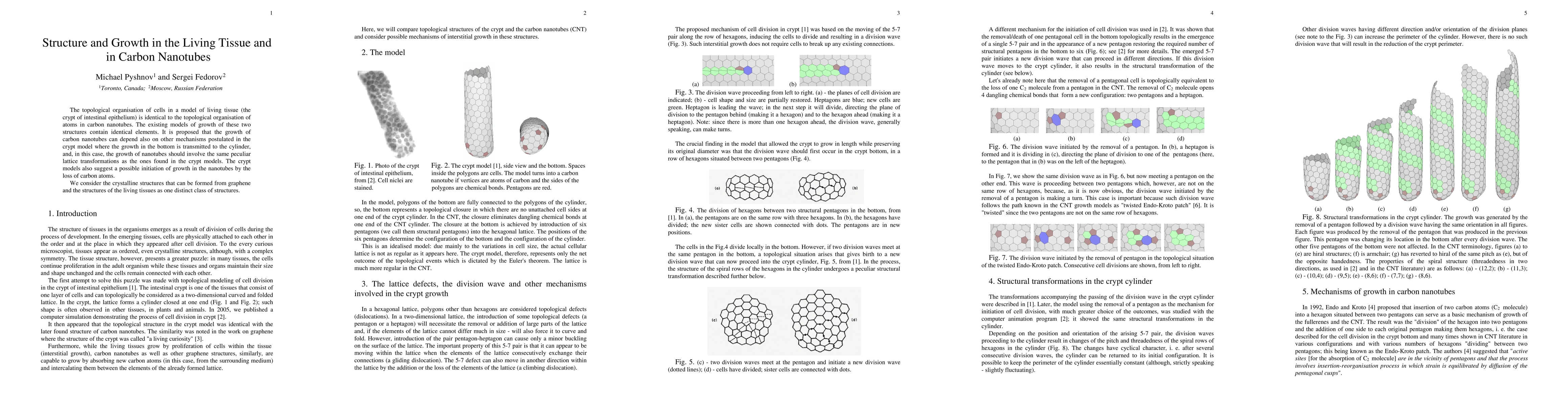 The topological organisation of cells in a model of living tissue (the crypt of intestinal epithelium) is identical to the topological organisation of atoms in carbon nanotubes. The existing models of growth of these two structures contain identical elements. It is proposed that the growth of carbon nanotubes can depend also on other mechanisms postulated in the crypt model where the growth in the bottom is transmitted to the cylinder, and, in this case, the growth of nanotubes should involve the same peculiar lattice transformations as the ones found in the crypt models. The crypt models also suggest a possible initiation of growth in the nanotubes by the loss of carbon atoms. We consider the crystalline structures that can be formed from graphene and the structures of the living tissues as one distinct class of structures.