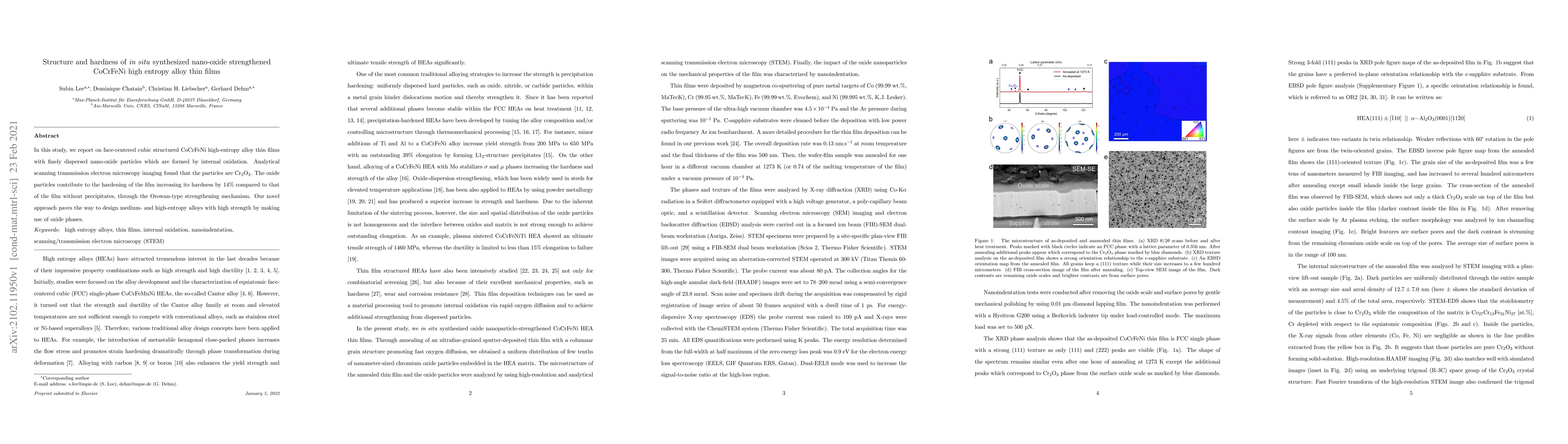 This study investigates CoCrFeNi high-entropy alloy thin films strengthened by in situ formed Cr2O3 nano-oxide particles, revealing a 14% increase in hardness through Orowan-type strengthening, suggesting a new method for designing high-strength medium- and high-entropy alloys.
