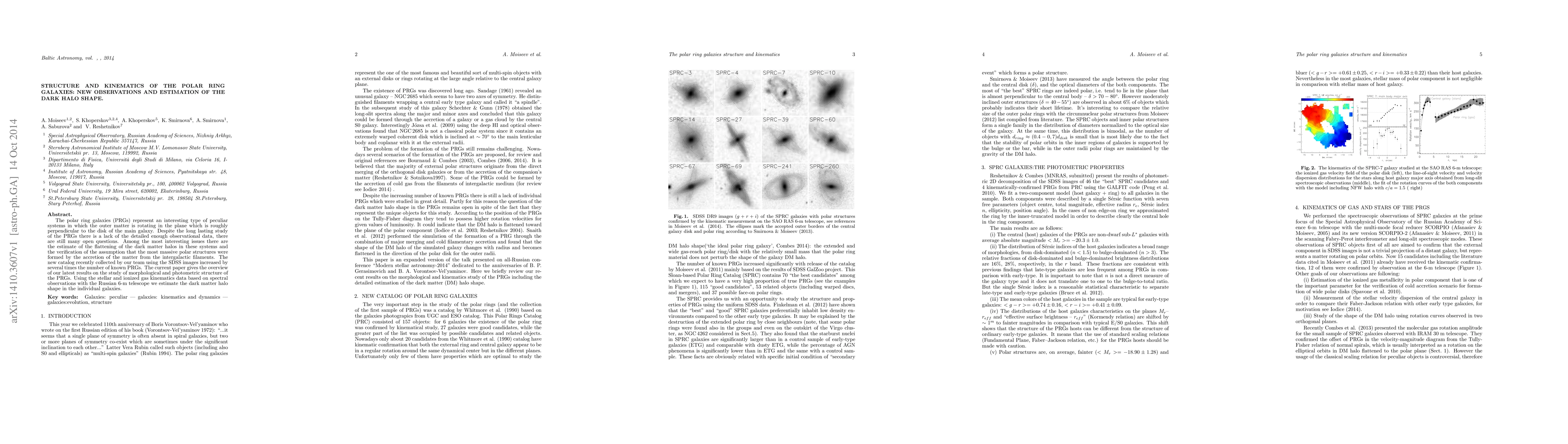 This paper presents new observations of polar ring galaxies (PRGs), increasing known examples using SDSS images. It details morphological and photometric structures, and estimates dark matter halo shapes via stellar and ionized gas kinematics from Russian 6-m telescope spectral data, aiming to understand PRG formation from intergalactic filament accretion.