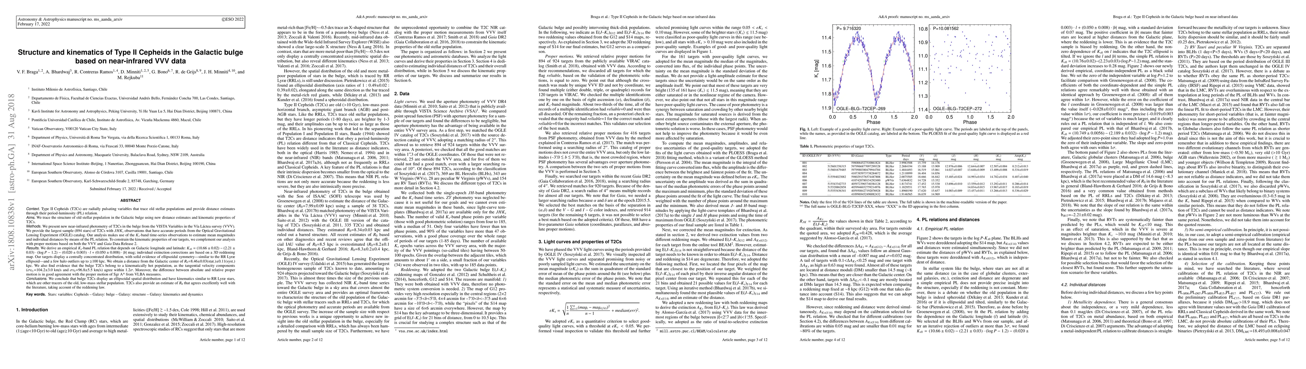 This paper analyzes the structure and kinematics of Type II Cepheids in the Galactic bulge using near-infrared VVV data, revealing an ellipsoidal distribution and kinematics similar to RR Lyrae stars. The study provides a new empirical period-luminosity relation and estimates a distance to the Galactic center of 8.46±0.11 kpc.