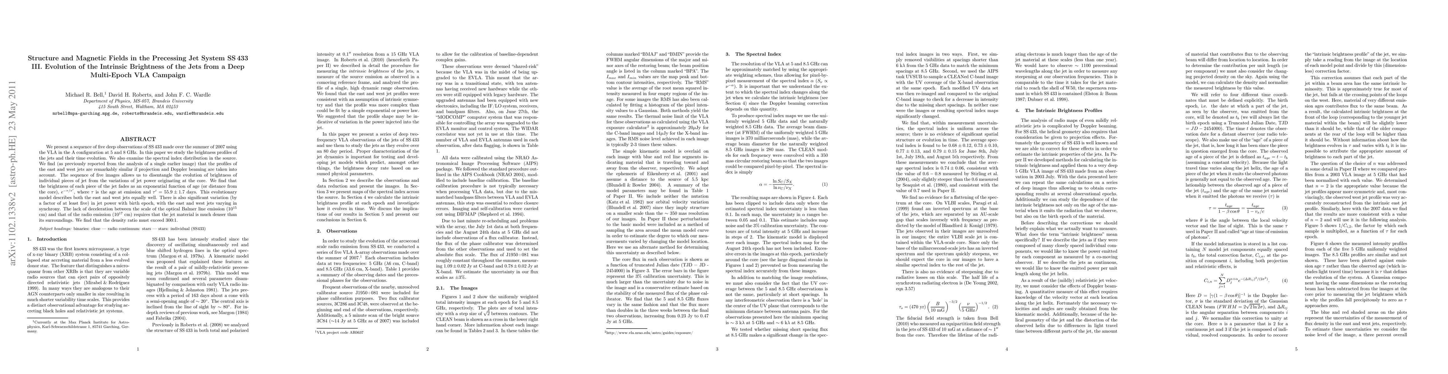 We present a sequence of five deep observations of SS433 made over the summer of 2007 using the VLA in the A configuration at 5 and 8 GHz. In this paper we study the brightness profiles of the jets and their time evolution. We also examine the spectral index distribution in the source. We find (as previously reported from the analysis of a single earlier image) that the profiles of the east and west jets are remarkably similar if projection and Doppler beaming are taken into account. The sequence of five images allows us to disentangle the evolution of brightness of individual pieces of jet from the variations of jet power originating at the core. We find that the brightness of each piece of the jet fades as an exponential function of age (or distance from the core), exp(-tau/tau'), where tau is the age at emission and tau' = 55.9 +- 1.7 days. This evolutionary model describes both the east and west jets equally well. There is also significant variation (by a factor of at least five) in jet power with birth epoch, with the east and west jets varying in synchrony. The lack of deceleration between the scale of the optical Balmer line emission (10^15 cm) and that of the radio emission (10^17 cm) requires that the jet material is much denser than its surroundings. We find that the density ratio must exceed 300:1.