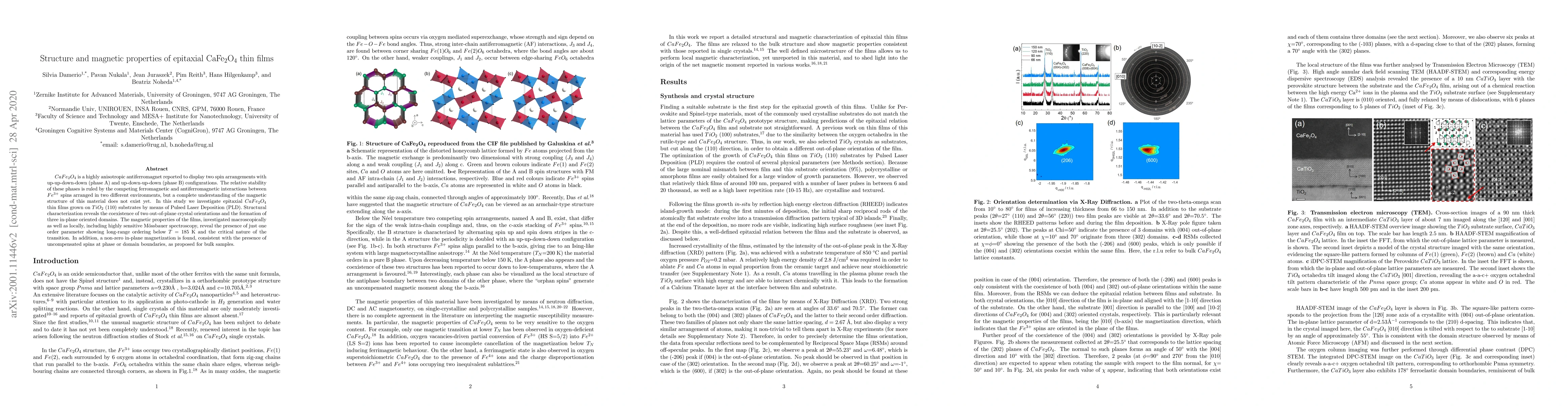 This study investigates epitaxial CaFe2O4 thin films grown on TiO2 substrates, revealing coexistence of two crystal orientations and three in-plane domains. Magnetic properties show a single order parameter with long-range ordering below 185 K, and non-zero in-plane magnetization due to uncompensated spins at phase or domain boundaries.