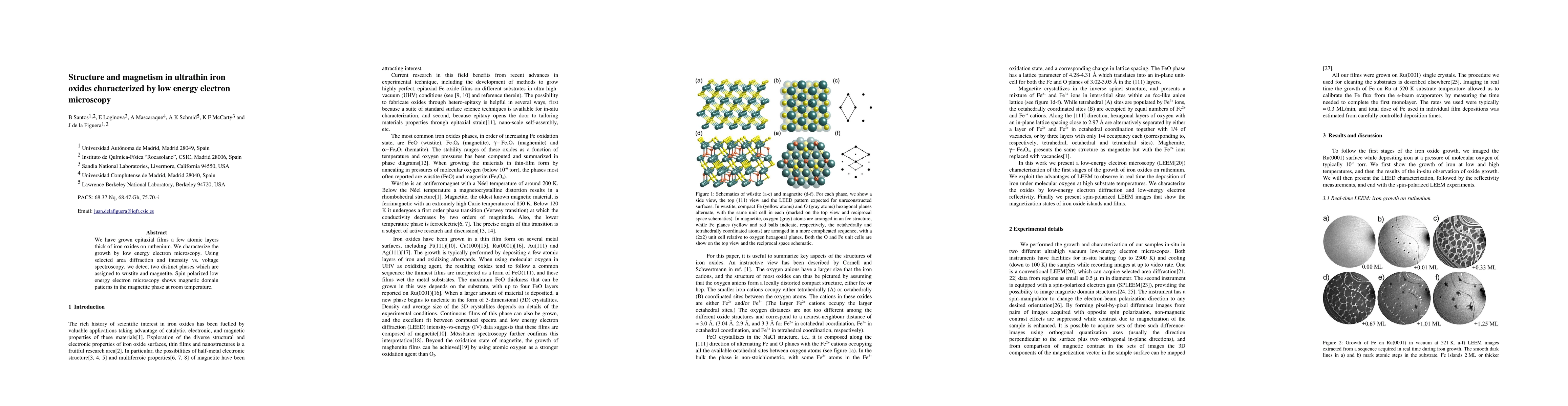 We have grown epitaxial films a few atomic layers thick of iron oxides on ruthenium. We characterize the growth by low energy electron microscopy. Using selected area diffraction and intensity vs. voltage spectroscopy, we detect two distinct phases which are assigned to wustite and magnetite. Spin polarized low energy electron microscopy shows magnetic domain patterns in the magnetite phase at room temperature.