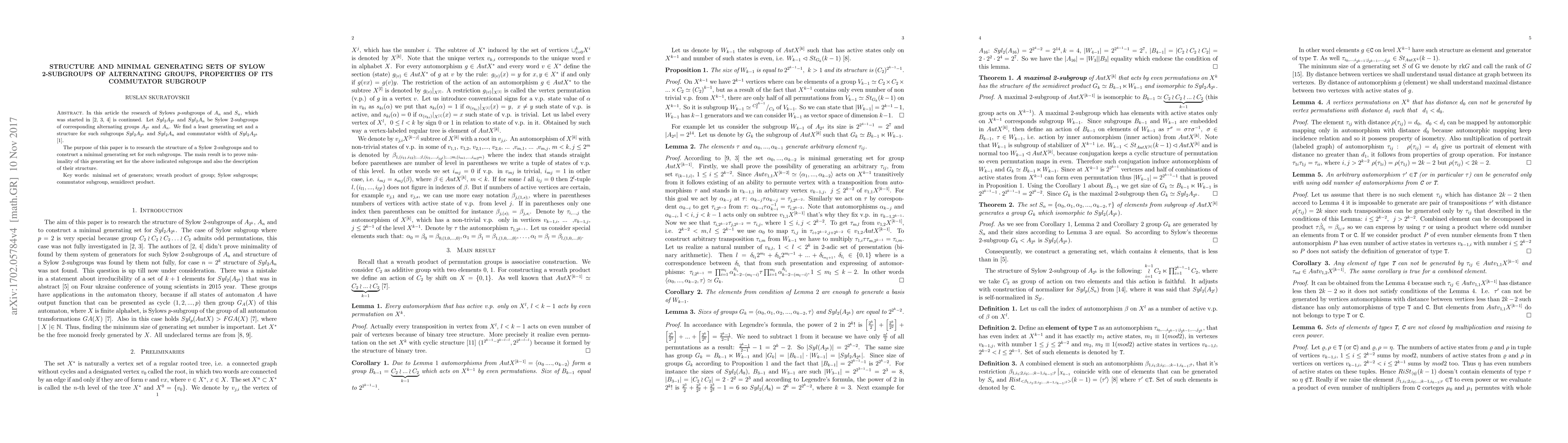 This paper investigates the structure and minimal generating sets of Sylow 2-subgroups in alternating groups $A_{2^k}$ and $A_n$, extending previous work. The authors prove the minimality of a newly constructed generating set and describe the commutator subgroup structure.