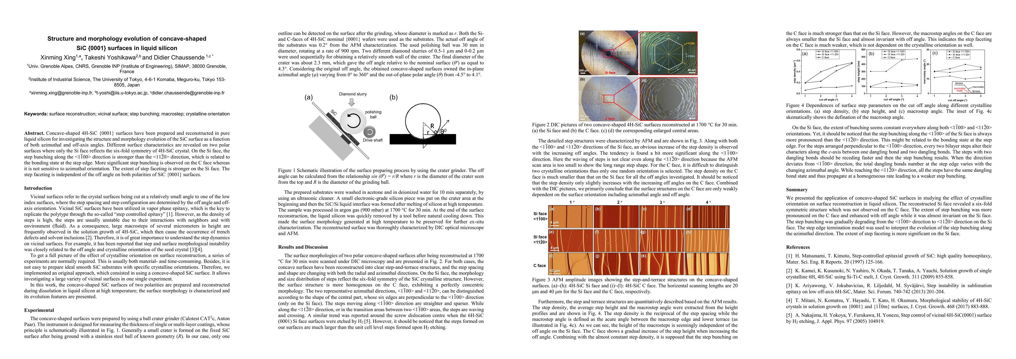 Researchers studied how a concave-shaped 4H-SiC surface behaves in liquid silicon, finding that the Si face exhibits step bunching related to bonding states and off-axis angles, while the C face shows no sensitivity to azimuthal orientation.