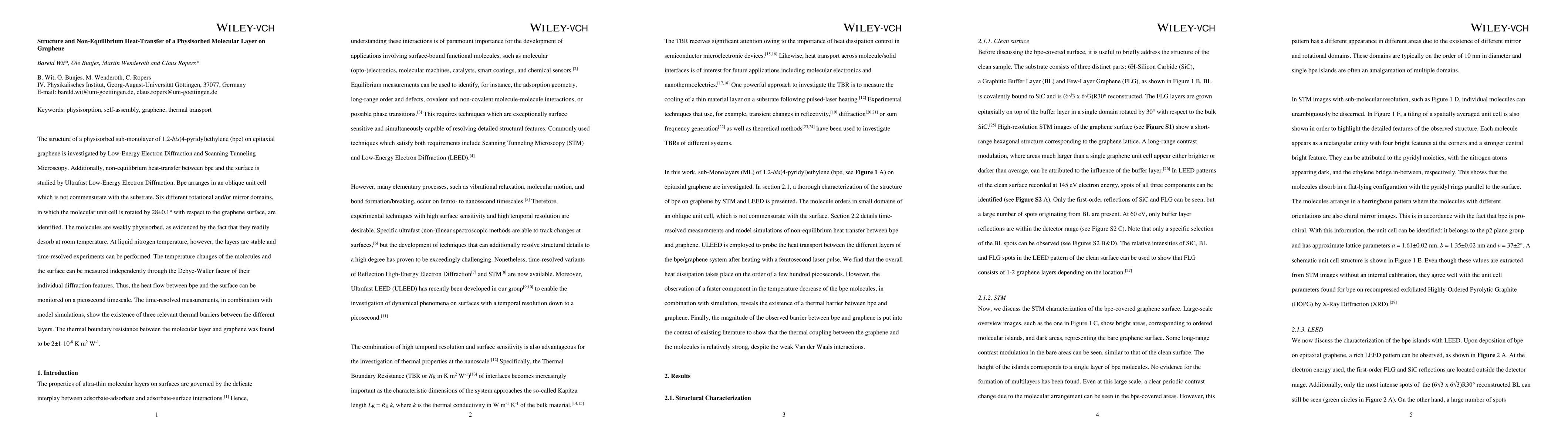 This paper investigates the structure and non-equilibrium heat-transfer of a physisorbed 1,2-bis(4-pyridyl)ethylene (bpe) layer on epitaxial graphene using Low-Energy Electron Diffraction and Scanning Tunneling Microscopy. The study reveals an oblique unit cell arrangement and identifies six rotational domains, while time-resolved experiments show three thermal barriers and a thermal boundary resistance of 2±1·10^-8 K m^2 W^-1.