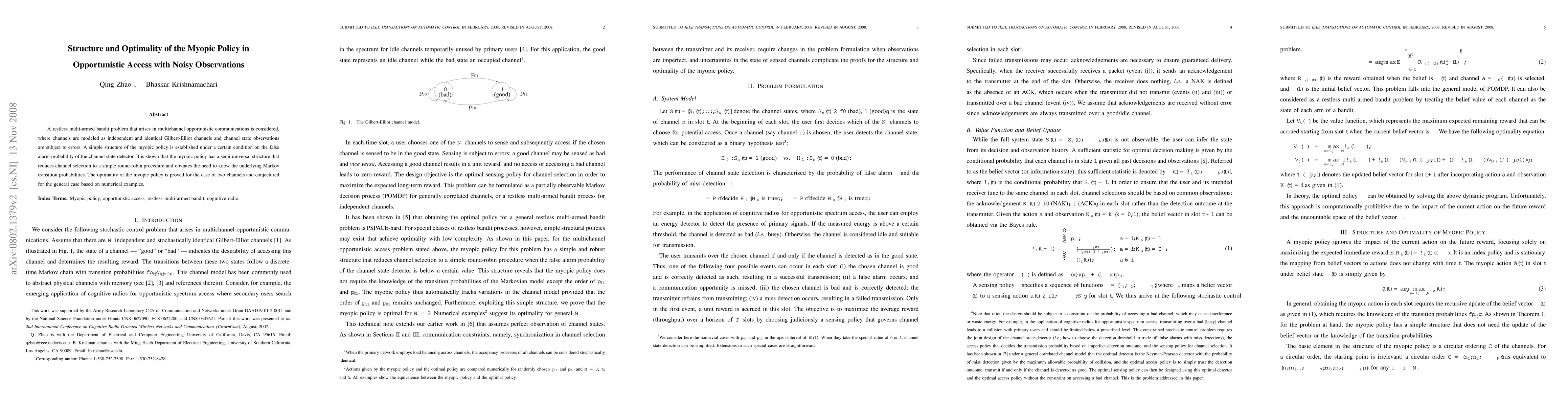This paper investigates a restless multi-armed bandit problem in multichannel opportunistic communication, focusing on the structure and optimality of a myopic policy under noisy observations. The authors establish a semi-universal structure for the myopic policy, simplifying channel selection, and prove its optimality for two channels with a conjecture for the general case based on numerical evidence.