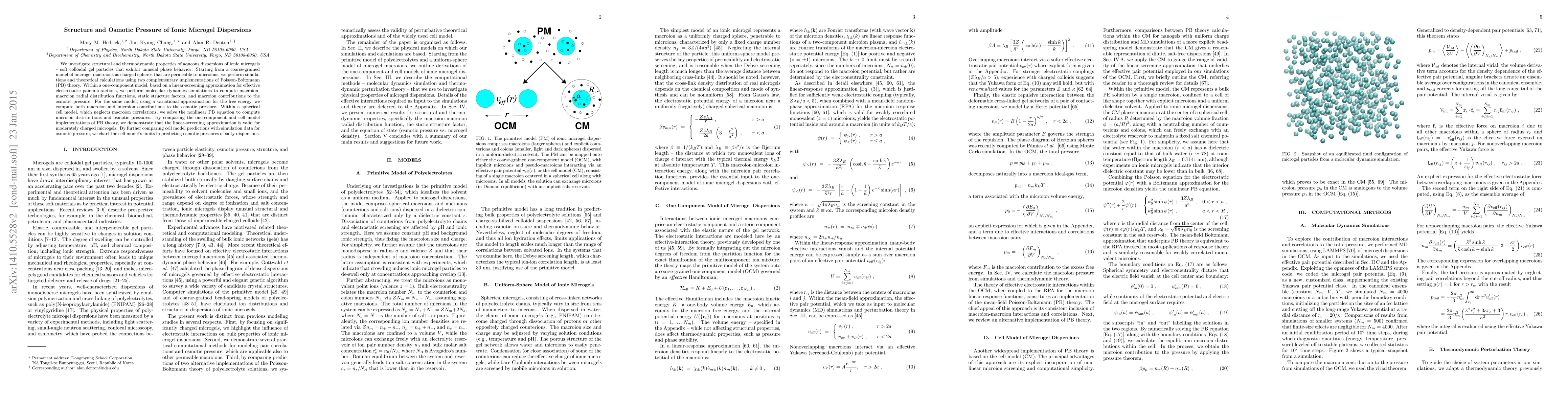 We investigate structural and thermodynamic properties of aqueous dispersions of ionic microgels -- soft colloidal gel particles that exhibit unusual phase behavior. Starting from a coarse-grained model of microgel macroions as charged spheres that are permeable to microions, we perform simulations and theoretical calculations using two complementary implementations of Poisson-Boltzmann (PB) theory. Within a one-component model, based on a linear-screening approximation for effective electrostatic pair interactions, we perform molecular dynamics simulations to compute macroion-macroion radial distribution functions, static structure factors, and macroion contributions to the osmotic pressure. For the same model, using a variational approximation for the free energy, we compute both macroion and microion contributions to the osmotic pressure. Within a spherical cell model, which neglects macroion correlations, we solve the nonlinear PB equation to compute microion distributions and osmotic pressures. By comparing the one-component and cell model implementations of PB theory, we demonstrate that the linear-screening approximation is valid for moderately charged microgels. By further comparing cell model predictions with simulation data for osmotic pressure, we chart the cell model's limits in predicting osmotic pressures of salty dispersions.