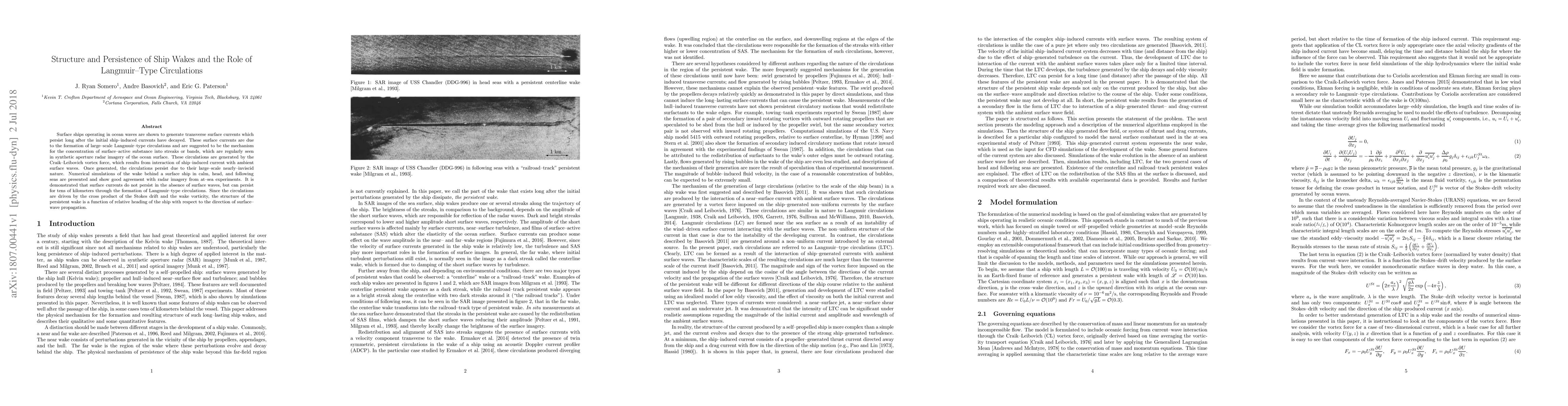 Surface ships operating in ocean waves are shown to generate transverse surface currents which persist long after the initial ship-induced currents have decayed. These surface currents are due to the formation of large-scale Langmuir-type circulations and are suggested to be the mechanism for the concentration of surface-active substance into streaks or bands, which are regularly seen in synthetic aperture radar imagery of the ocean surface. These circulations are generated by the Craik-Leibovich vortex force, which results from interaction of ship-induced current with ambient surface waves. Once generated, the circulations persist due to their large-scale nearly-inviscid nature. Numerical simulations of the wake behind a surface ship in calm, head, and following seas are presented and show good agreement with radar imagery from at-sea experiments. It is demonstrated that surface currents do not persist in the absence of surface waves, but can persist for tens of kilometers through the formation of Langmuir-type circulations. Since the circulations are driven by the cross product of the Stokes drift and the wake vorticity, the structure of the persistent wake is a function of relative heading of the ship with respect to the direction of surface-wave propagation.