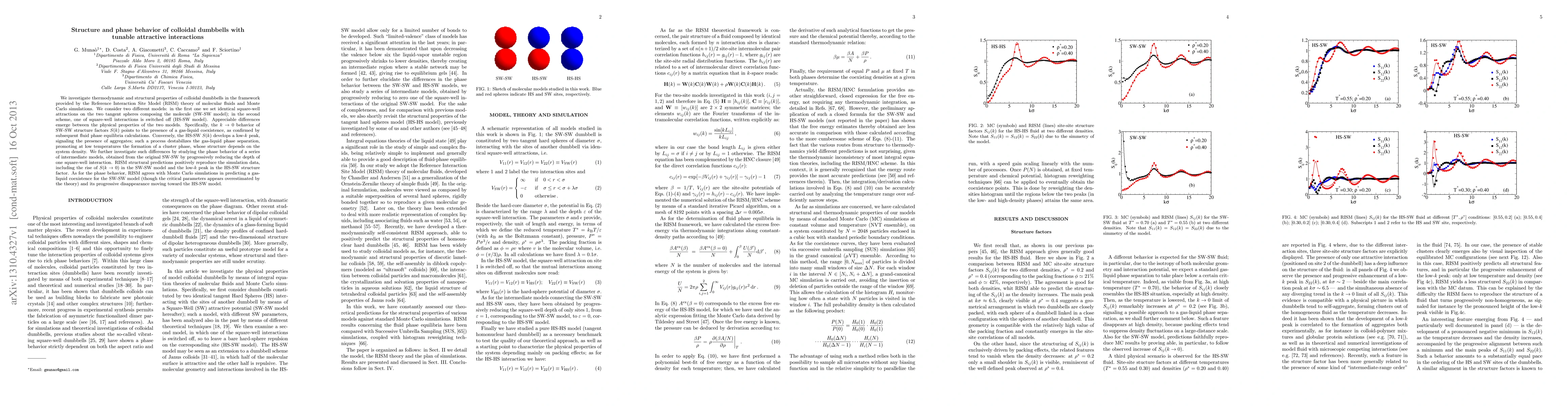 We investigate thermodynamic and structural properties of colloidal dumbbells in the framework provided by the Reference Interaction Site Model (RISM) theory of molecular fluids and Monte Carlo simulations. We consider two different models: in the first one we set identical square-well attractions on the two tangent spheres composing the molecule (SW-SW model); in the second scheme, one of square-well interactions is switched off (HS-SW model). Appreciable differences emerge between the physical properties of the two models. Specifically, the $k \to 0$ behavior of SW-SW structure factors $S(k)$ points to the presence of a gas-liquid coexistence, as confirmed by subsequent fluid phase equilibria calculations. Conversely, the HS-SW $S(k)$ develops a low-$k$ peak, signaling the presence of aggregates; such a process destabilizes the gas-liquid phase separation, promoting at low temperatures the formation of a cluster phase, whose structure depends on the system density. We further investigate such differences by studying the phase behavior of a series of intermediate models, obtained from the original SW-SW by progressively reducing the depth of one square-well interaction. RISM structural predictions positively reproduce the simulation data, including the rise of $S(k \to 0$) in the SW-SW model and the low-$k$ peak in the HS-SW structure factor. As for the phase behavior, RISM agrees with Monte Carlo simulations in predicting a gas-liquid coexistence for the SW-SW model (though the critical parameters appears overestimated by the theory) and its progressive disappearance moving toward the HS-SW model.