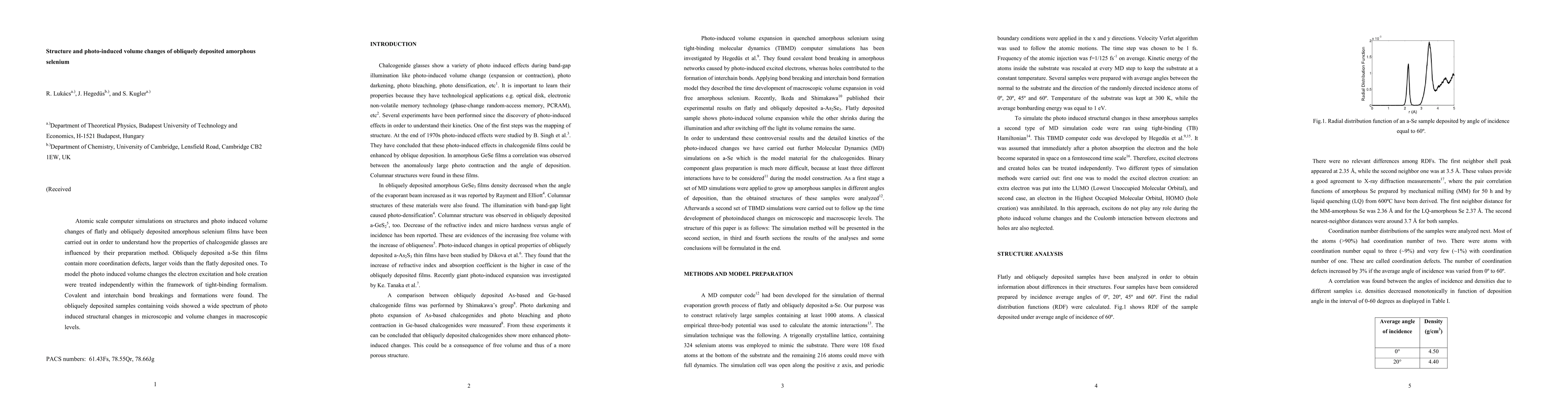 Atomic scale computer simulations on structures and photo induced volume changes of flatly and obliquely deposited amorphous selenium films have been carried out in order to understand how the properties of chalcogenide glasses are influenced by their preparation method. Obliquely deposited a-Se thin films contain more coordination defects, larger voids than the flatly deposited ones. To model the photo induced volume changes the electron excitation and hole creation were treated independently within the framework of tight-binding formalism. Covalent and interchain bond breakings and formations were found. The obliquely deposited samples containing voids showed a wide spectrum of photo induced structural changes in microscopic and volume changes in macroscopic levels.