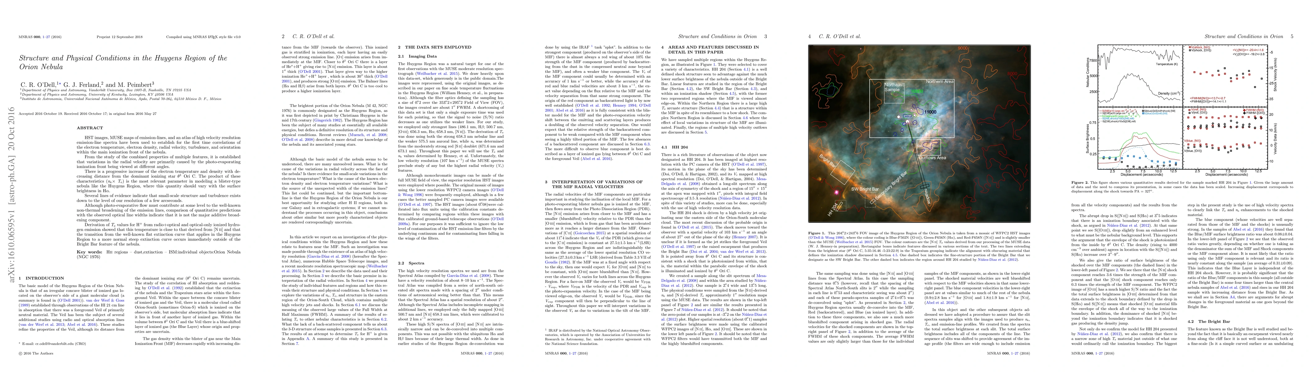 HST images, MUSE maps of emission-lines, and an atlas of high velocity resolution emission-line spectra have been used to establish for the firrst time correlations of the electron temperature, electron density, radial velocity, turbulence, and orientation within the main ionization front of the nebula. From the study of the combined properties of multiple features, it is established that variations in the radial velocity are primarily caused by the photo-evaporating ionization front being viewed at different angles. There is a progressive increase of the electron temperature and density with decreasing distance from the dominant ionizing star Theta1 Ori C. The product of these characteristics (NexTe) is the most relevant parameter in modeling a blister-type nebula like the Huygens Region, where this quantity should vary with the surface brightness in Halpha. Several lines of evidence indicate that small-scale structure and turbulence exists down to the level of our resolution of a few arcseconds. Although photo-evaporative ow must contribute at some level to the well-known non-thermal broadening of the emission lines, comparison of quantitative predictions with the observed optical line widths indicate that it is not the major additive broad- ening component. Derivation of Te values for H+ from radio+optical and optical-only ionized hydro- gen emission showed that this temperature is close to that derived from [Nii] and that the transition from the well-known at extinction curve that applies in the Huygens Region to a more normal steep extinction curve occurs immediately outside of the Bright Bar feature of the nebula.