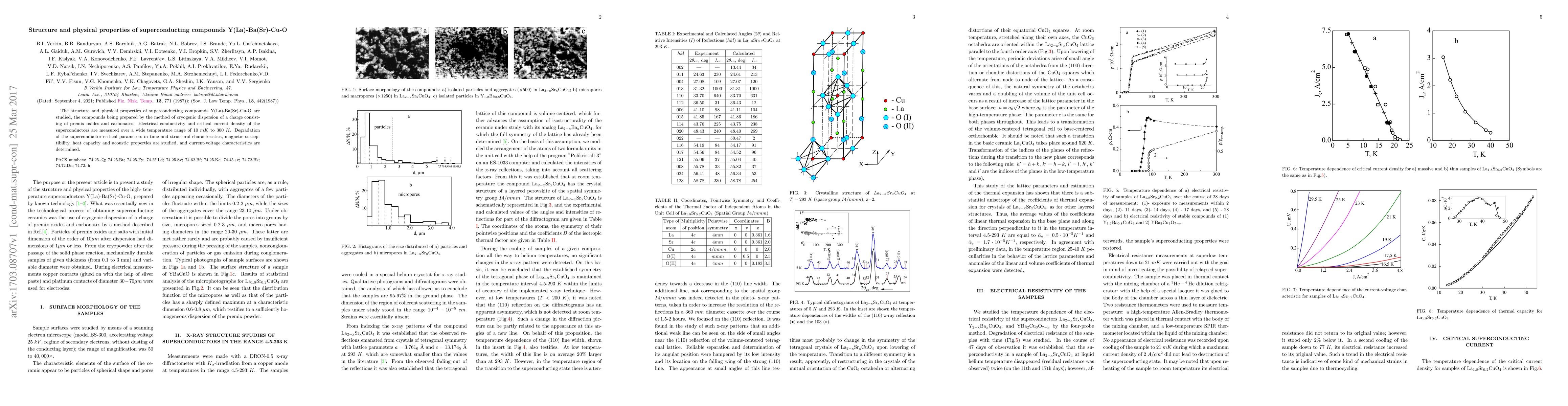 This paper investigates the structure and physical properties of Y(La)-Ba(Sr)-Cu-O superconducting compounds, prepared via cryogenic dispersion. It measures electrical conductivity, critical current density, and various degradation factors over a temperature range from 10~$mK$ to 300~$K$, alongside structural characteristics, magnetic susceptibility, heat capacity, and acoustic properties.