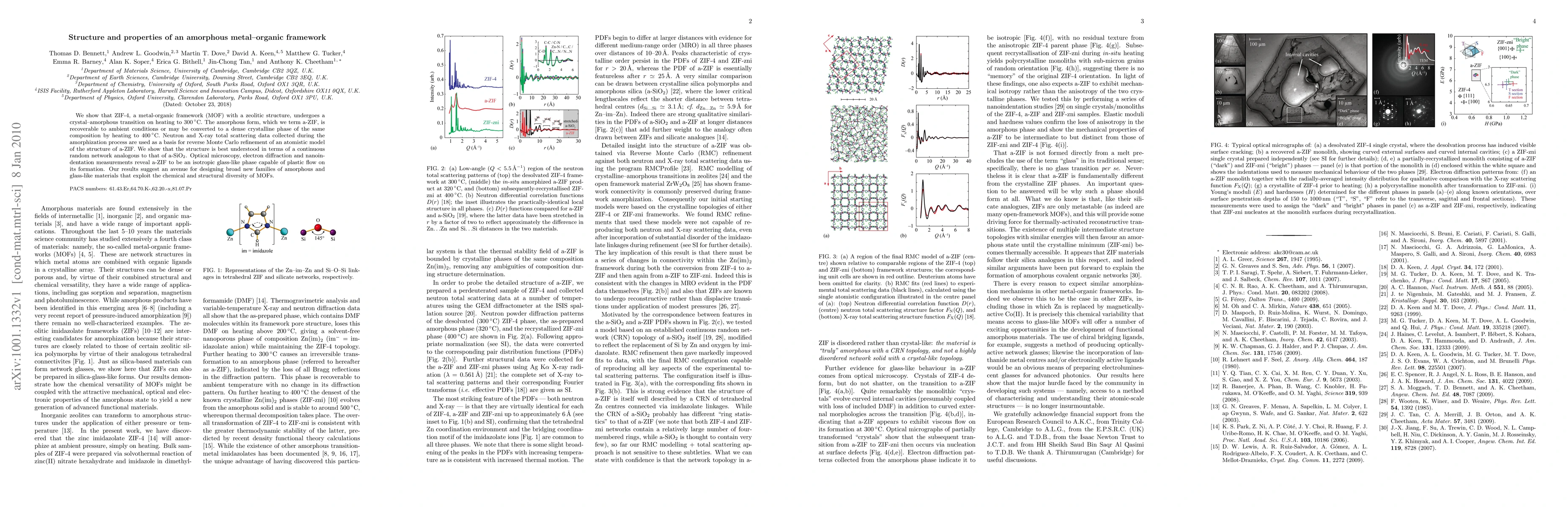 This paper explores the crystal-amorphous transition of ZIF-4, a metal-organic framework, revealing its transformation into an amorphous phase termed a-ZIF upon heating. The study utilizes neutron and X-ray scattering to model a-ZIF's structure, showing it forms a continuous random network akin to a-SiO$_2$, and demonstrates its glass-like properties through microscopy and nanoindentation.