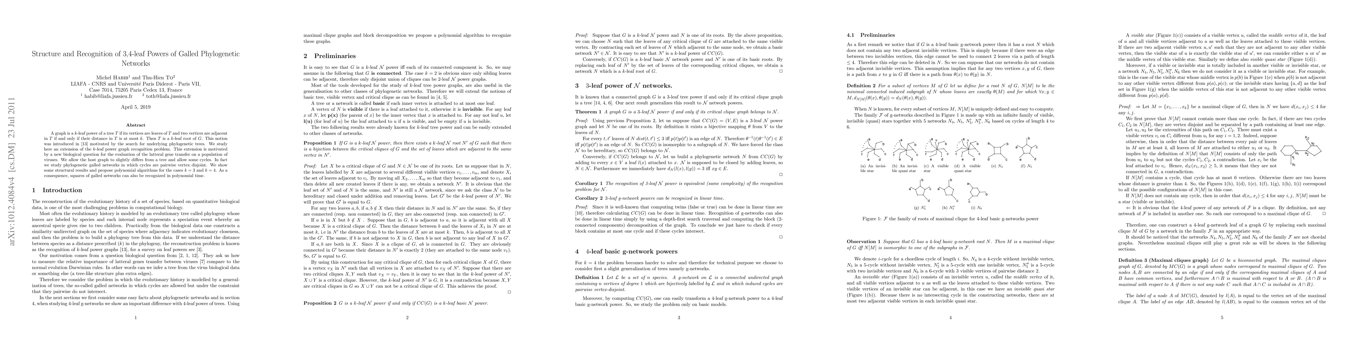 A graph is a $k$-leaf power of a tree $T$ if its vertices are leaves of $T$ and two vertices are adjacent in $T$ if and only if their distance in $T$ is at most $k$. Then $T$ is a $k$-leaf root of $G$. This notion was introduced by Nishimura, Ragde, and Thilikos [2002] motivated by the search for underlying phylogenetic trees. We study here an extension of the $k$-leaf power graph recognition problem. This extension is motivated by a new biological question for the evaluation of the latteral gene transfer on a population of viruses. We allow the host graph to slightly differs from a tree and allow some cycles. In fact we study phylogenetic galled networks in which cycles are pairwise vertex disjoint. We show some structural results and propose polynomial algorithms for the cases $k=3$ and $k=4$. As a consequence, squares of galled networks can also be recognized in polynomial time.