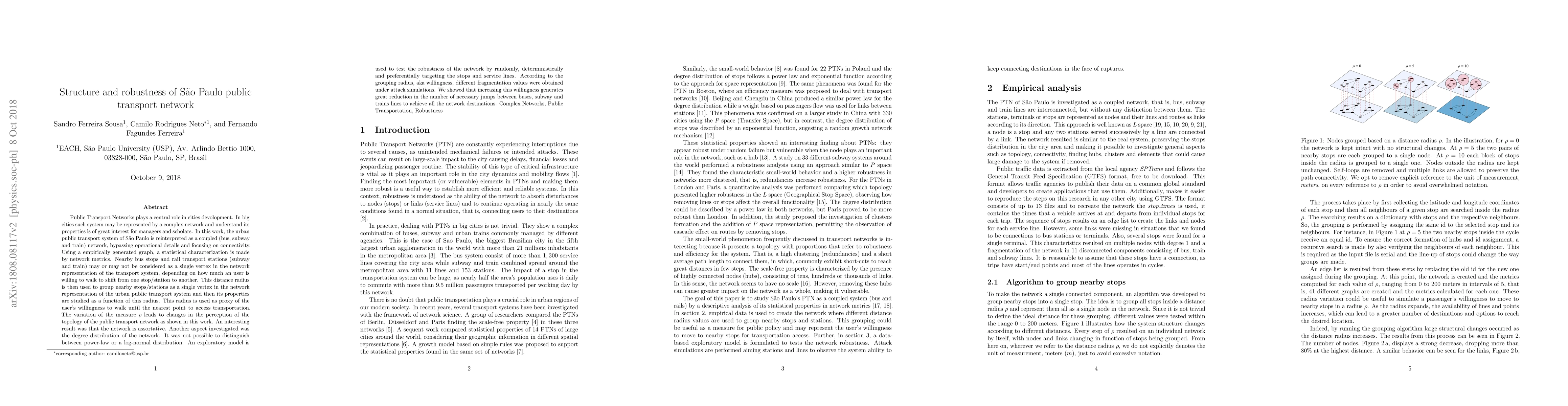 This paper studies the connectivity and robustness of São Paulo's public transport network, represented as a coupled bus, subway, and train network. The authors analyze the network's topology and degree distribution, finding it to be assortative, with no clear power-law or log-normal degree distribution. They test the network's robustness under various attack scenarios, showing that higher willingness to walk reduces fragmentation and necessary transfers.