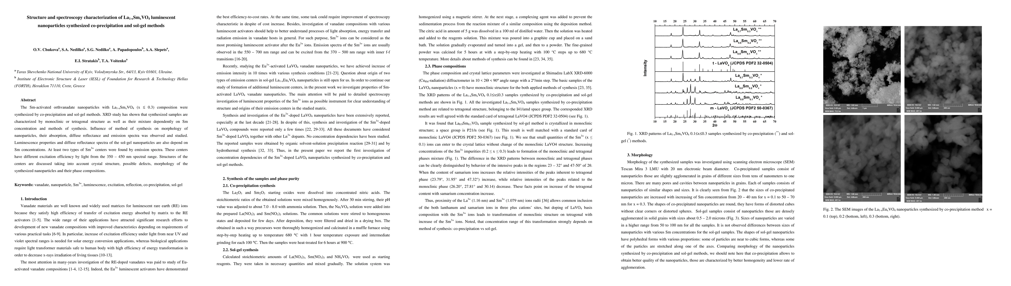 The Sm-activated orthvanadate nanoparticles were synthesized by co-precipitation and sol-gel methods. XRD study has shown that synthesized samples are characterized by monoclinic or tetragonal structure as well as their mixture dependently on Sm concentration and methods of synthesis. Influence of method of synthesis on morphology of nanoparticles, their absorption, diffuse reflectance and emission spectra was observed and studied.