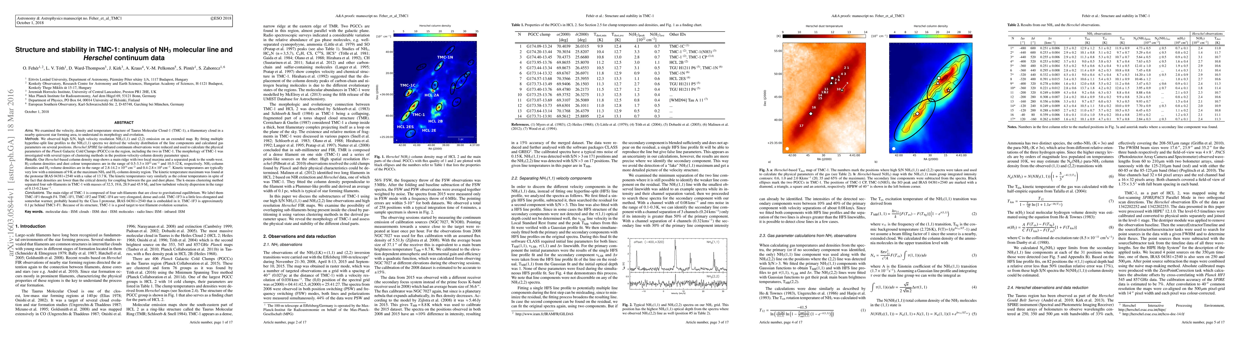 We observed high S/N, high velocity resolution NH$_3$(1,1) and (2,2) emission on an extended map in TMC-1, a filamentary cloud in a nearby quiescent star forming area. By fitting multiple hyperfine-split line profiles to the NH$_3$(1,1) spectra we derived the velocity distribution of the line components and calculated gas parameters on several positions. Herschel SPIRE continuum observations were reduced and used to calculate the physical parameters of the Planck Galactic Cold Clumps in the region. The Herschel-based column density map of TMC-1 shows a main ridge with two local maxima and a separated peak to the south-west. H$_2$-column densities and dust temperatures are in the range of 0.5-3.3 $\times$ 10$^{22}$ cm$^{-2}$ and 10.5-12 K, respectively. NH$_3$-column densities are 2.8-14.2 $\times$ 10$^{14}$ cm$^{-2}$ and and H$_2$-volume densities are 0.4-2.8 $\times$ 10$^4$ cm$^{-3}$. Kinetic temperatures are typically very low with a minimum of 9 K, and a maximum of 13.7 K was found at the Class I protostar IRAS 04381+2540. The kinetic temperatures vary similarly as the dust temperatures in spite of the fact that densities are lower than the critical density for coupling between the gas and dust phase. The k-means clustering method separated four sub-filaments in TMC-1 in the position-velocity-column density parameter space. They have masses of 32.5, 19.6, 28.9 and 45.9 M$_{\odot}$, low turbulent velocity dispersion (0.13-0.2 kms$^{-1}$) and they are close to gravitational equilibrium. We label them TMC-1F1 through F4. TMC-1F1, TMC-1F2 and TMC-1F4 are very elongated, dense and cold. TMC-1F3 is a little less elongated and somewhat warmer, probably heated by IRAS 04381+2540 that is embedded in it. TMC-1F3 is $\approx$ 0.1 pc behind TMC1-F1. Because of its structure, TMC-1 is a good target to test filament evolution scenarios.