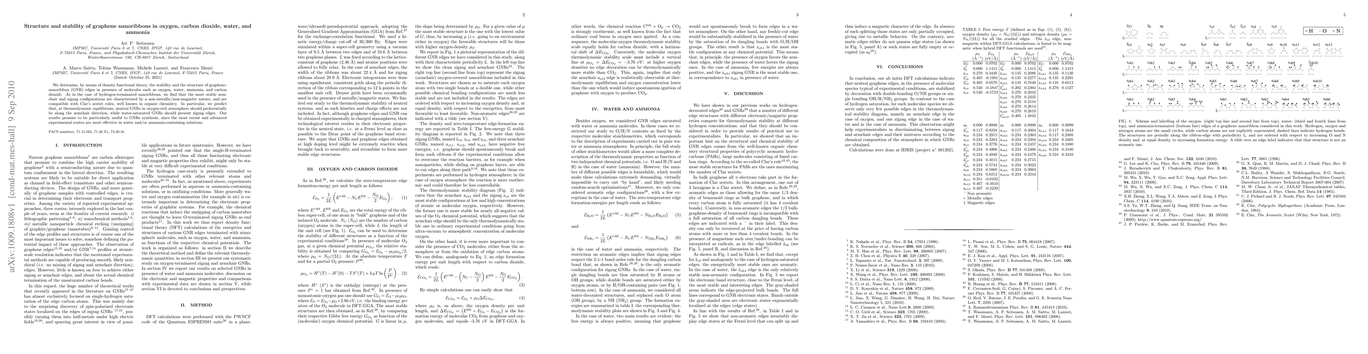 This paper uses density functional theory to analyze the stability and structure of graphene nanoribbon edges in various environments, including oxygen, carbon dioxide, water, and ammonia. It finds that armchair edges are most stable in oxygen-rich conditions, while zigzag edges are favored in water, aiding in the synthesis of GNRs in aqueous solutions.