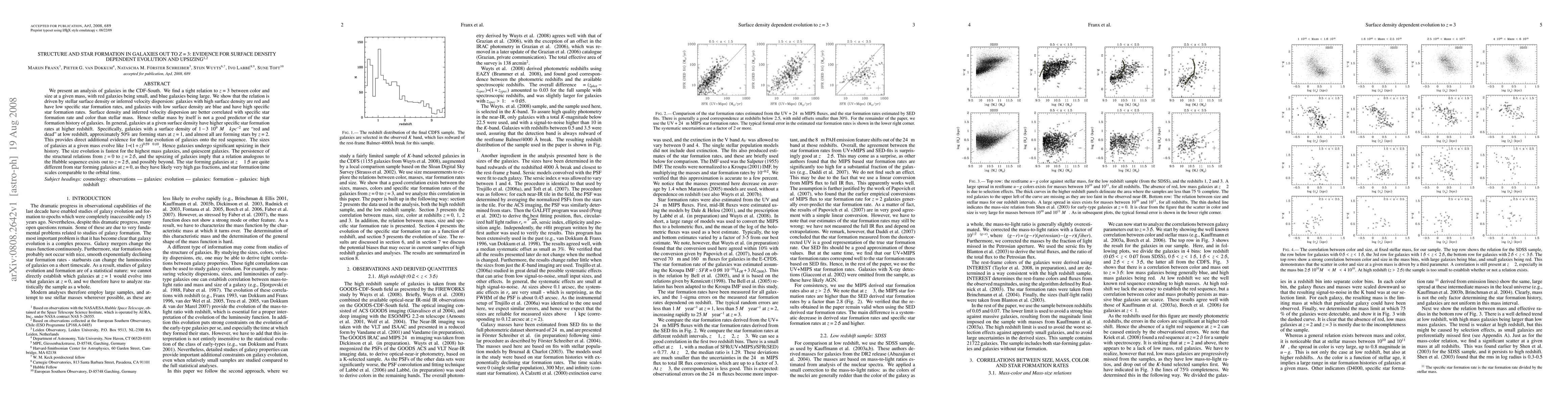 This paper analyzes galaxies in the CDF-South up to z=3, revealing a strong correlation between color, size, and stellar surface density, indicating that star formation rates are better predicted by surface density than stellar mass. Galaxies undergo significant upsizing and late evolution onto the red sequence, suggesting a structural relation analogous to the Hubble sequence extends to z=2.5.