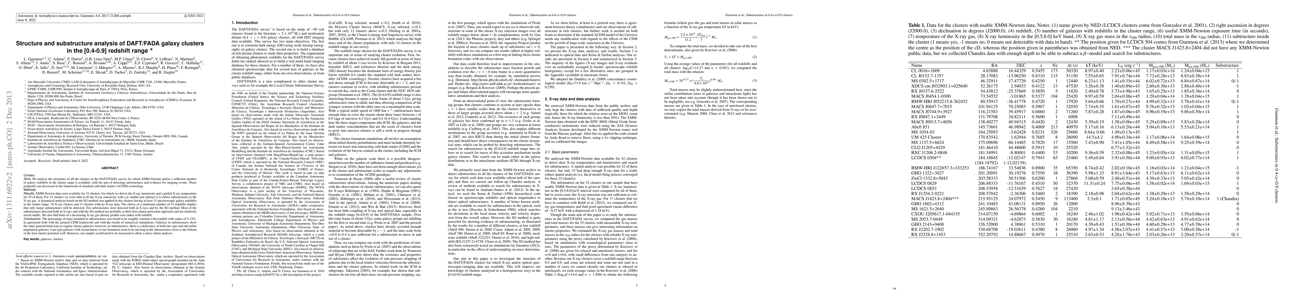 We analyse the structures of all the clusters in the DAFT/FADA survey for which XMM-Newton and/or a sufficient number of galaxy redshifts in the cluster range is available, with the aim of detecting substructures and evidence for merging events. These properties are discussed in the framework of standard cold dark matter cosmology.XMM-Newton data were available for 32 clusters, for which we derive the X-ray luminosity and a global X-ray temperature for 25 of them. For 23 clusters we were able to fit the X-ray emissivity with a beta-model and subtract it to detect substructures in the X-ray gas. A dynamical analysis based on the SG method was applied to the clusters having at least 15 spectroscopic galaxy redshifts in the cluster range: 18 X-ray clusters and 11 clusters with no X-ray data. Only major substructures will be detected. Ten substructures were detected both in X-rays and by the SG method. Most of the substructures detected both in X-rays and with the SG method are probably at their first cluster pericentre approach and are relatively recent infalls. We also find hints of a decreasing X-ray gas density profile core radius with redshift. The percentage of mass included in substructures was found to be roughly constant with redshift with values of 5-15%, in agreement both with the general CDM framework and with the results of numerical simulations. Galaxies in substructures show the same general behaviour as regular cluster galaxies; however, in substructures, there is a deficiency of both late type and old stellar population galaxies. Late type galaxies with recent bursts of star formation seem to be missing in the substructures close to the bottom of the host cluster potential well. However, our sample would need to be increased to allow a more robust analysis.