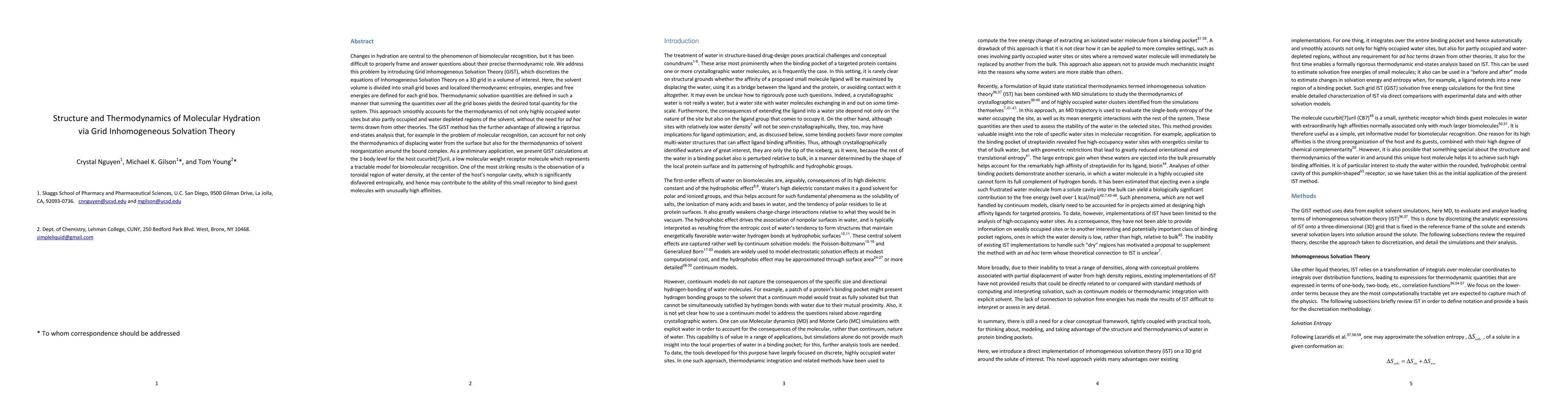 The paper introduces Grid Inhomogeneous Solvation Theory (GIST) to precisely frame and analyze the thermodynamic role of hydration changes in biomolecular recognition. GIST discretizes solvent volume into grid boxes, allowing localized thermodynamic quantities and a rigorous end-states analysis for solvent reorganization, demonstrated through calculations on cucurbit[7]uril, revealing a toroidal region of water density that contributes to high binding affinity.