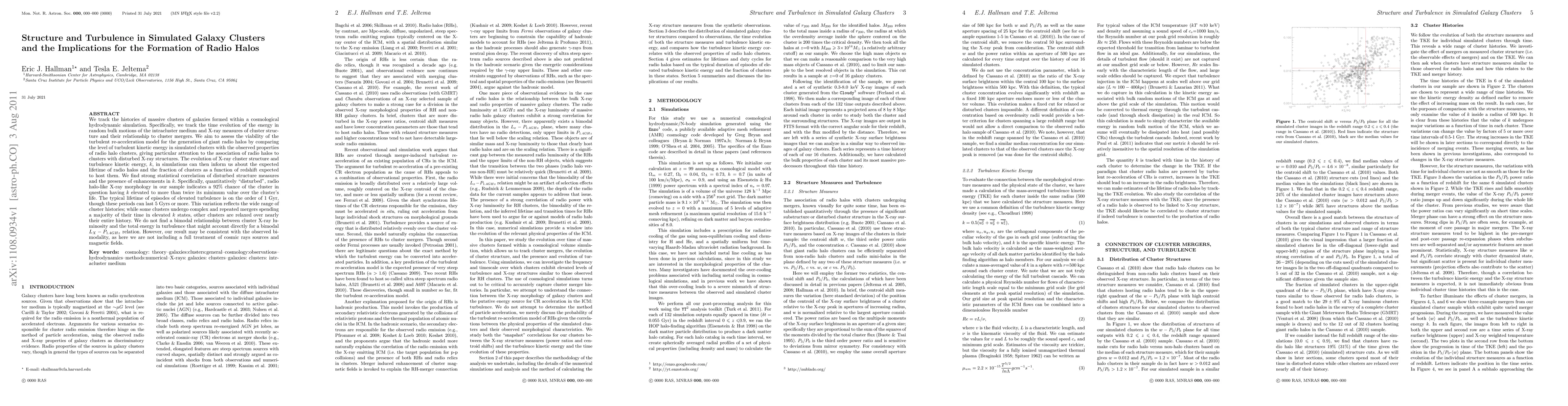 We track the histories of massive clusters of galaxies formed within a cosmological hydrodynamic simulation. Specifically, we track the time evolution of the energy in random bulk motions of the intracluster medium and X-ray measures of cluster structure and their relationship to cluster mergers. We aim to assess the viability of the turbulent re-acceleration model for the generation of giant radio halos by comparing the level of turbulent kinetic energy in simulated clusters with the observed properties of radio halo clusters, giving particular attention to the association of radio halos to clusters with disturbedX-ray structures. The evolution of X-ray cluster structure and turbulence kinetic energy, k, in simulations can then inform us about the expected lifetime of radio halos and the fraction of clusters as a function of redshift expected to host them. We find strong statistical correlation of disturbed structure measures and the presence of enhancements in k. Specifically, quantitatively "disturbed", radio halo-like X-ray morphology in our sample indicates a 92% chance of the cluster in question having k elevated to more than twice its minimum value over the cluster's life. The typical lifetime of episodes of elevated turbulence is on the order of 1 Gyr, though these periods can last 5 Gyrs or more. This variation reflects the wide range of cluster histories; while some clusters undergo complex and repeated mergers spending a majority of their time in elevated k states, other clusters are relaxed over nearly their entire history. We do not find a bimodal relationship between cluster X-ray luminosity and the total energy in turbulence that might account directly for a bimodal L_X-P_{1.4 GHz} relation. However, our result may be consistent with the observed bimodality, as here we are not including a full treatment of cosmic rays sources and magnetic fields.