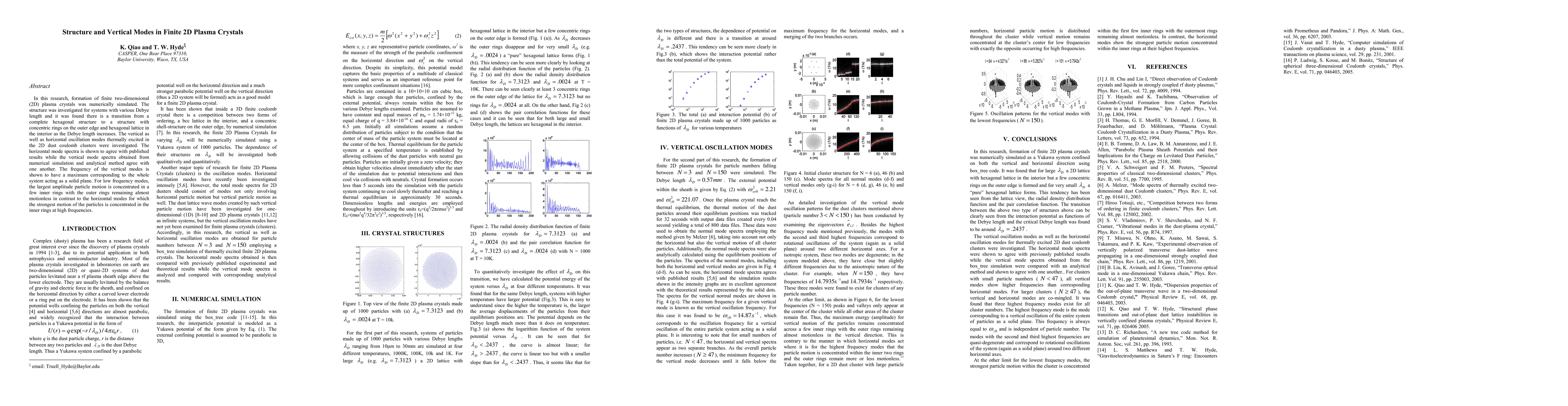 In this research, formation of finite two-dimensional (2D) plasma crystals was numerically simulated. The structure was investigated for systems with various Debye length and it was found there is a transition from a complete hexagonal structure to a structure with concentric rings on the outer edge and hexagonal lattice in the interior as the Debye length increases. The vertical as well as horizontal oscillation modes thermally excited in the 2D dust coulomb clusters were investigated. The horizontal mode spectra is shown to agree with published results while the vertical mode spectra obtained from numerical simulation and analytical method agree with one another. The frequency of the vertical modes is shown to have a maximum corresponding to the whole system acting as a solid plane. For low frequency modes, the largest amplitude particle motion is concentrated in a few inner rings with the outer rings remaining almost motionless in contrast to the horizontal modes for which the strongest motion of the particles is concentrated in the inner rings at high frequencies.