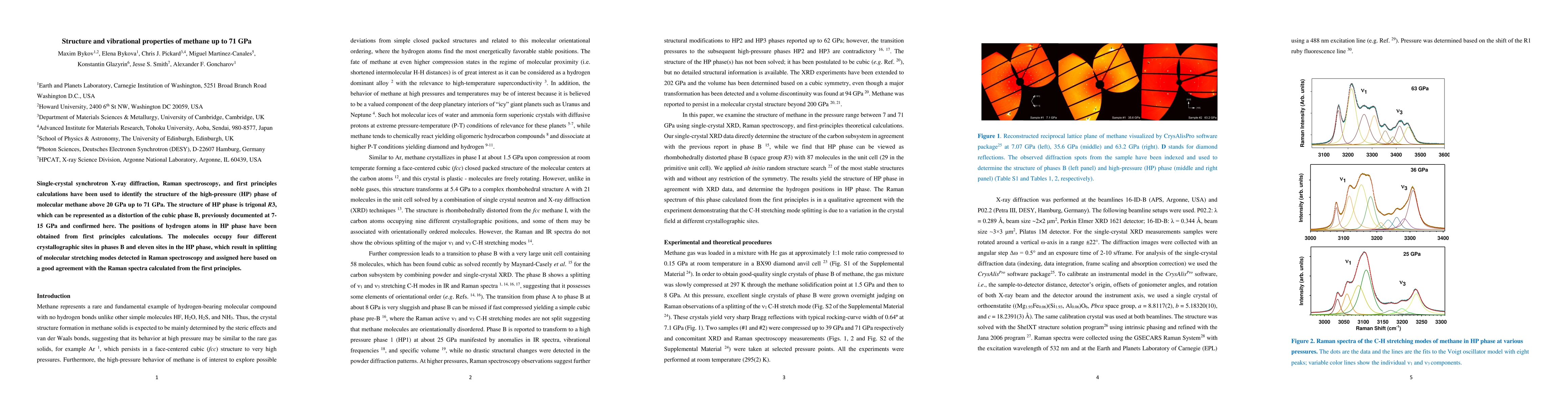 Single-crystal synchrotron X-ray diffraction, Raman spectroscopy, and first principles calculations have been used to identify the structure of the high-pressure (HP) phase of molecular methane above 20 GPa up to 71 GPa. The structure of HP phase is trigonal R3, which can be represented as a distortion of the cubic phase B, previously documented at 7-15 GPa and confirmed here. The positions of hydrogen atoms in HP phase have been 19 obtained from first principles calculations. The molecules occupy four different crystallographic sites in phases B and eleven sites in the HP phase, which result in splitting of molecular stretching modes detected in Raman spectroscopy and assigned here based on 22 a good agreement with the Raman spectra calculated from the first principles.