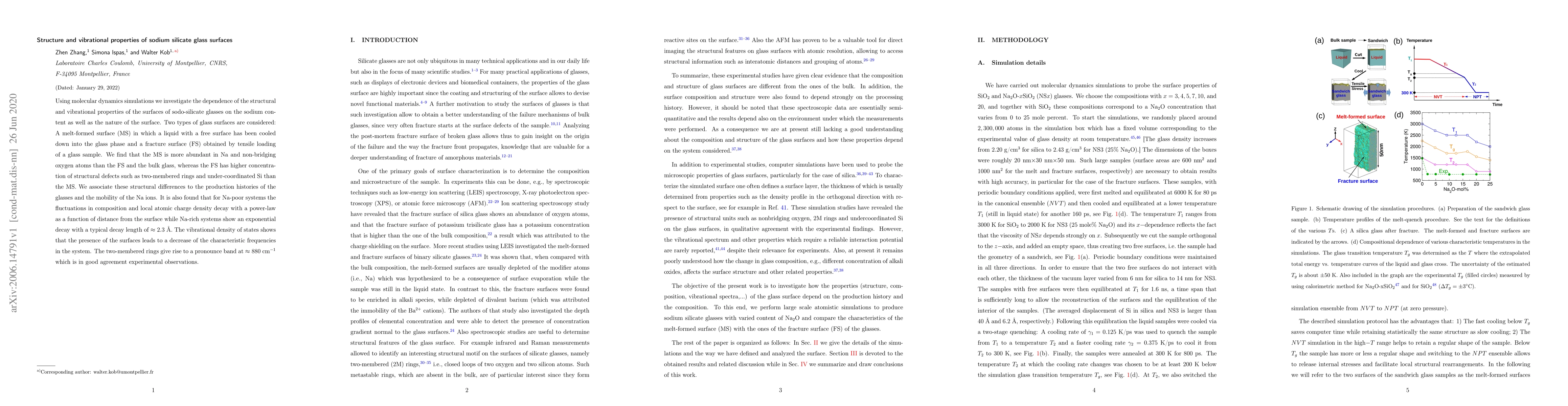 This study uses molecular dynamics simulations to explore how sodium content and surface type affect the structural and vibrational properties of sodium silicate glass surfaces. The melt-formed surface is richer in Na and non-bridging oxygen, while the fracture surface has more structural defects, leading to distinct vibrational density of states and characteristic frequencies.