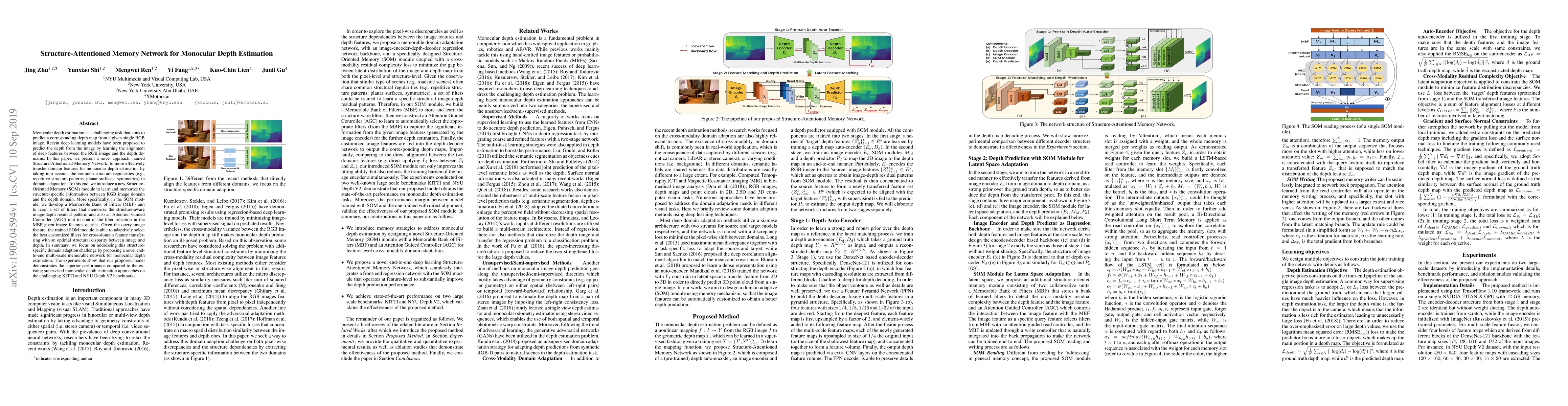 The paper proposes a novel Structure-Attentioned Memory Network for monocular depth estimation, utilizing a Structure-Oriented Memory module with a Memorable Bank of Filters and an Attention Guided Controller to adaptively transfer domain-specific features, achieving superior performance on KITTI and NYU Depth V2 benchmarks.