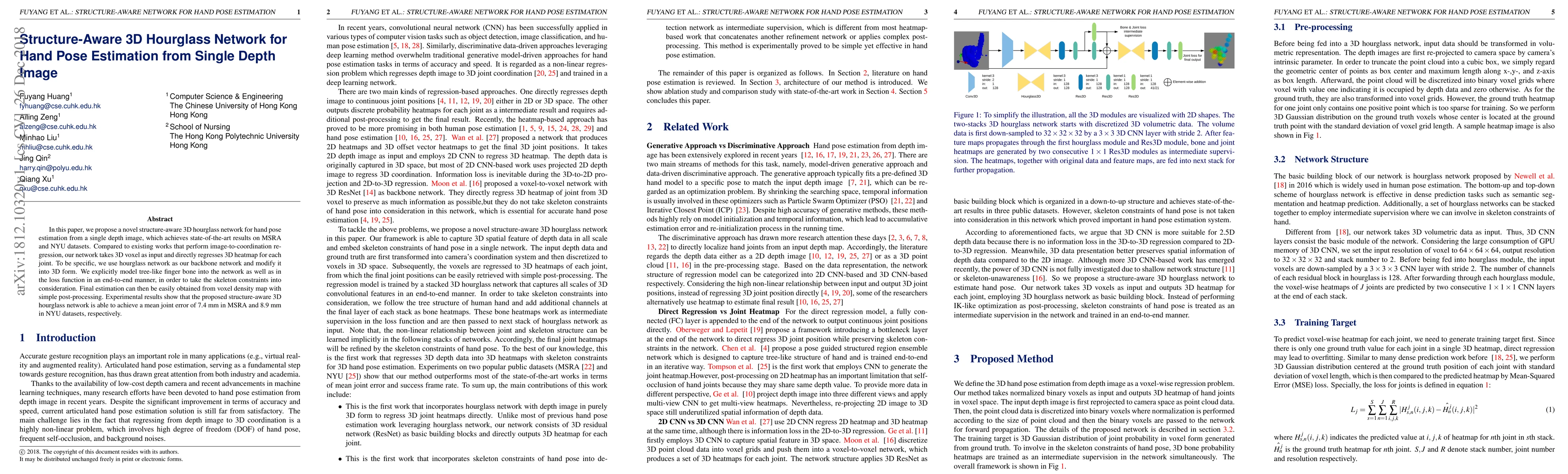 This paper proposes a novel structure-aware 3D hourglass network for hand pose estimation from single depth images, achieving state-of-the-art results. The network directly regresses 3D heatmaps for each joint, incorporating skeleton constraints through explicit modeling of finger bones.