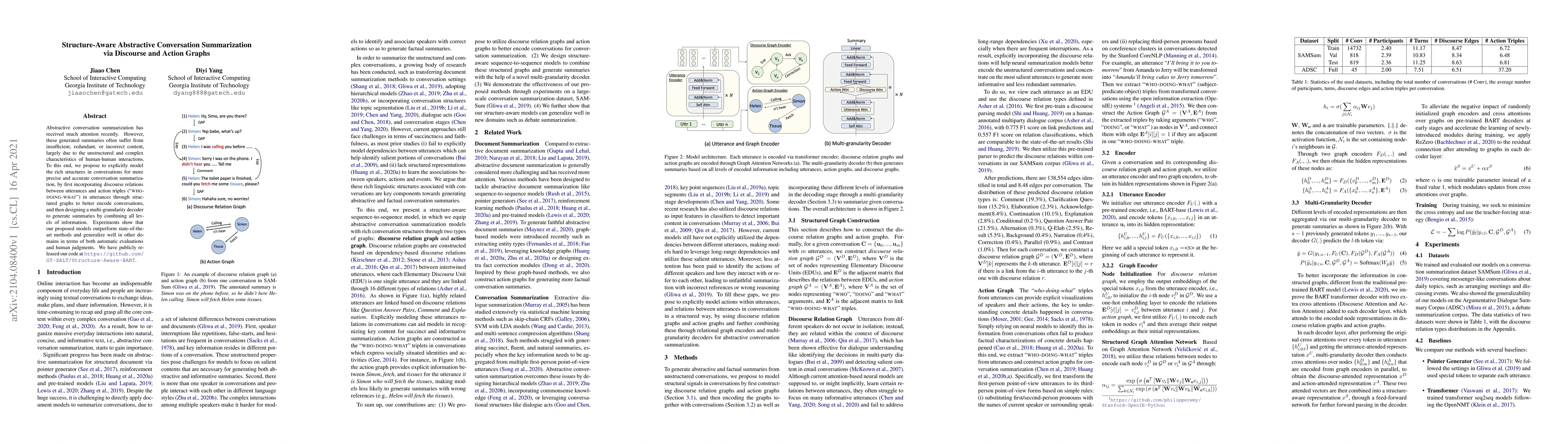 This paper proposes a method for abstractive conversation summarization that models conversation structures via discourse relations and action graphs, leading to more precise summaries. The model outperforms existing methods in automatic evaluations and human judgments, demonstrating generalization across domains.
