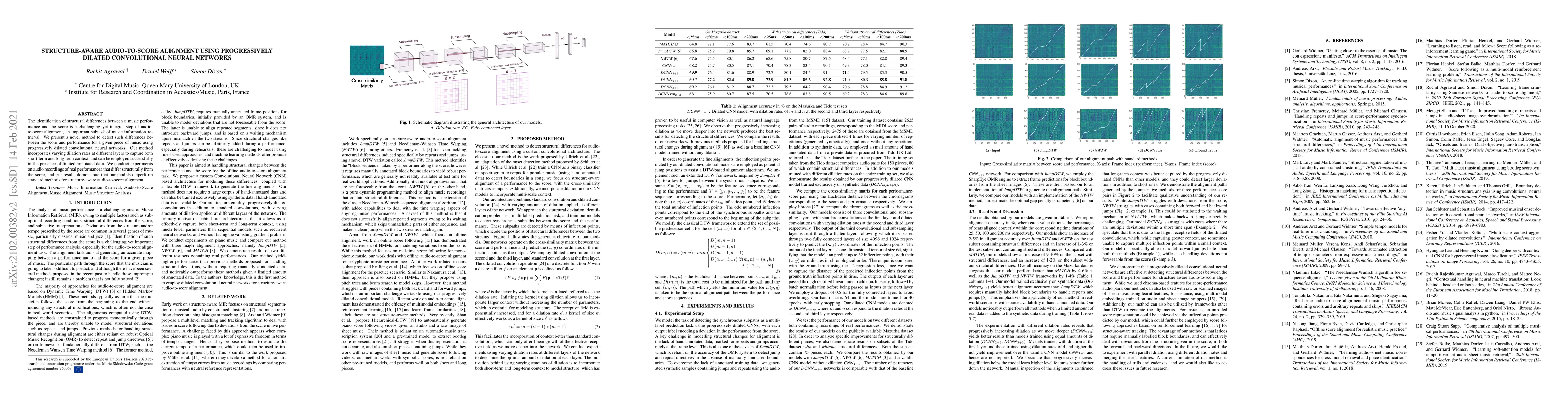 This paper proposes a novel method for audio-to-score alignment using progressively dilated convolutional neural networks to detect structural differences between music performances and scores. The method captures both short-term and long-term context through varying dilation rates and outperforms standard methods, even with limited annotated data.