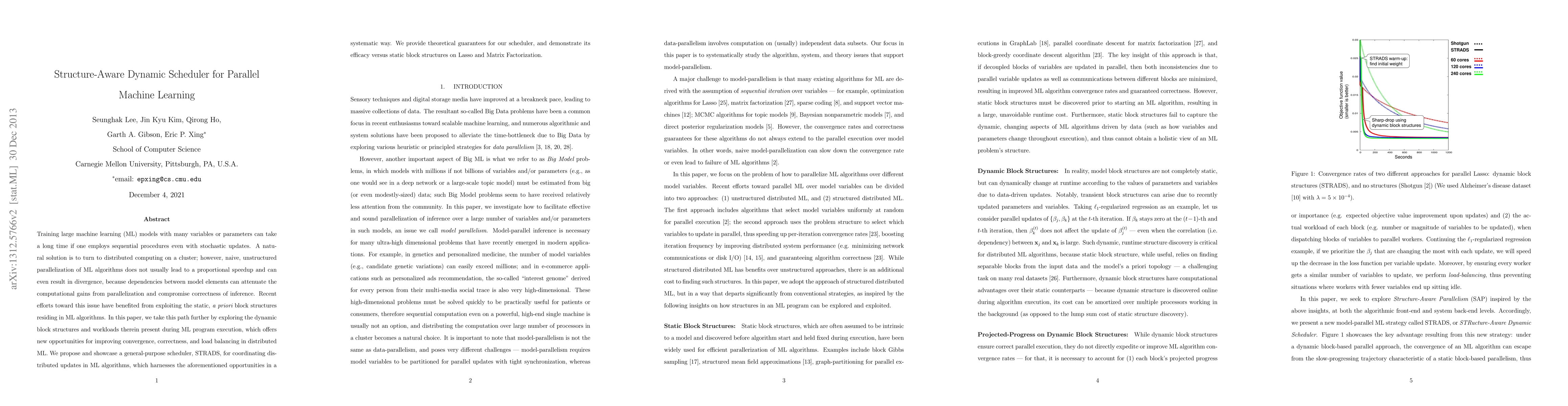 This paper proposes STRADS, a structure-aware dynamic scheduler for improving parallel machine learning training by leveraging dynamic block structures and workloads during execution. The scheduler aims to enhance convergence, correctness, and load balancing in distributed ML, providing theoretical guarantees and demonstrating effectiveness over static methods.