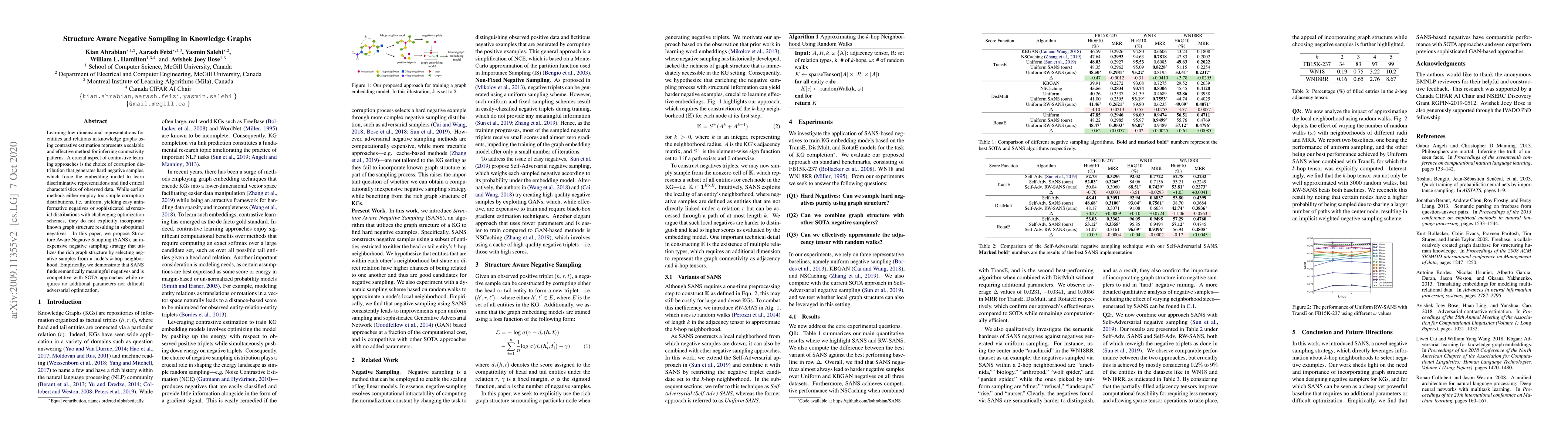 This paper proposes Structure Aware Negative Sampling (SANS) to enhance knowledge graph representation learning by generating meaningful negative samples from a node's k-hop neighborhood, leveraging the graph's inherent structure. SANS outperforms simpler and more complex negative sampling methods without requiring additional parameters or adversarial optimization.