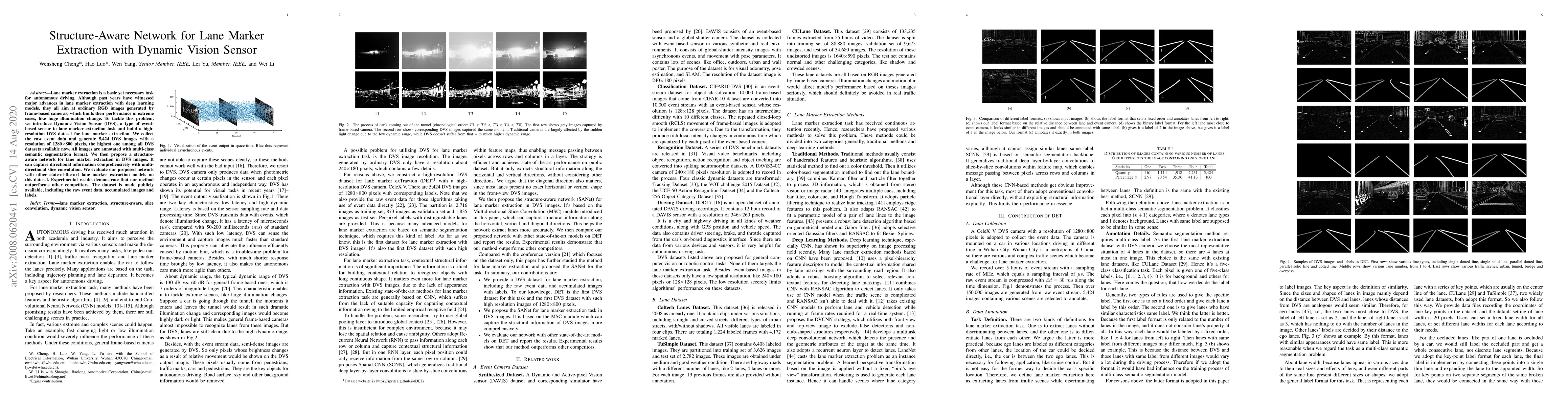 Lane marker extraction is a basic yet necessary task for autonomous driving. Although past years have witnessed major advances in lane marker extraction with deep learning models, they all aim at ordinary RGB images generated by frame-based cameras, which limits their performance in extreme cases, like huge illumination change. To tackle this problem, we introduce Dynamic Vision Sensor (DVS), a type of event-based sensor to lane marker extraction task and build a high-resolution DVS dataset for lane marker extraction. We collect the raw event data and generate 5,424 DVS images with a resolution of 1280$\times$800 pixels, the highest one among all DVS datasets available now. All images are annotated with multi-class semantic segmentation format. We then propose a structure-aware network for lane marker extraction in DVS images. It can capture directional information comprehensively with multidirectional slice convolution. We evaluate our proposed network with other state-of-the-art lane marker extraction models on this dataset. Experimental results demonstrate that our method outperforms other competitors. The dataset is made publicly available, including the raw event data, accumulated images and labels.