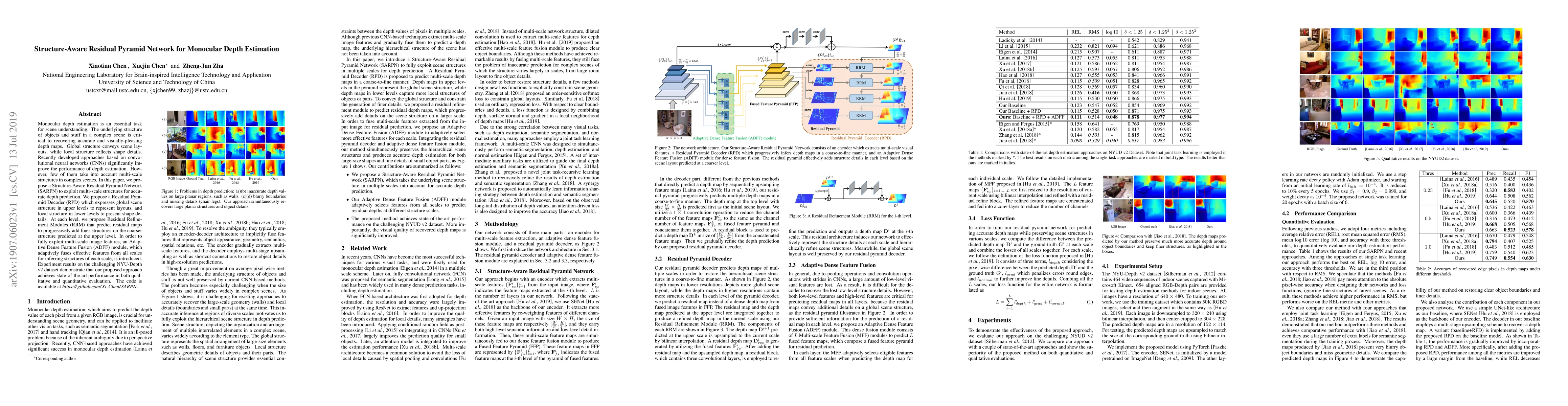 This paper proposes a Structure-Aware Residual Pyramid Network (SARPN) for monocular depth estimation, utilizing a Residual Pyramid Decoder and Residual Refinement Modules to capture multi-scale structures. An Adaptive Dense Feature Fusion module enhances feature integration across scales, achieving state-of-the-art performance on the NYU-Depth v2 dataset.