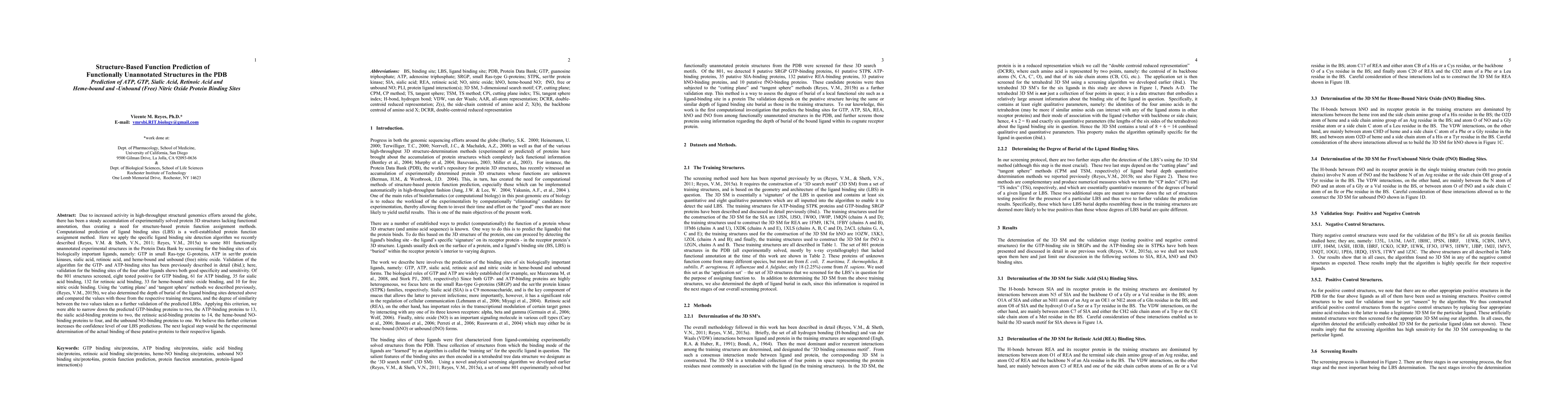 Due to increased activity in high-throughput structural genomics efforts around the globe, there has been an accumulation of experimental protein 3D structures lacking functional annotation, thus creating a need for structure-based protein function assignment methods. Computational prediction of ligand binding sites (LBS) is a well-established protein function assignment method. Here we apply the specific LBS detection algorithm we recently described (Reyes, V.M. & Sheth, V.N., 2011; Reyes, V.M., 2015a) to some 801 functionally unannotated experimental structures in the Protein Data Bank by screening for the binding sites (BS) of 6 biologically important ligands: GTP in small Ras-type G-proteins, ATP in ser/thr protein kinases, sialic acid (SIA), retinoic acid (REA), and heme-bound and unbound (free) nitric oxide (hNO, fNO). Validation of the algorithm for the GTP- and ATP-binding sites has been previously described in detail (ibid.); here, validation for the BSs of the 4 other ligands shows both good specificity and sensitivity. Of the 801 structures screened, 8 tested positive for GTP binding, 61 for ATP binding, 35 for SIA binding, 132 for REA binding, 33 for hNO binding, and 10 for fNO binding. Using the cutting plane and tangent sphere methods we described previously, (Reyes, V.M., 2015b), we also determined the depth of burial of the LBSs detected above and compared the values with those from the respective training structures, and the degree of similarity between the two values taken as a further validation of the predicted LBSs. Applying this criterion, we were able to narrow down the predicted GTP-binding proteins to 2, the ATP-binding proteins to 13, the SIA-binding proteins to 2, the REA-binding proteins to 14, the hNO-binding proteins to 4, and the fNO-binding proteins to 1. We believe this further criterion increases the confidence level of our LBS predictions.