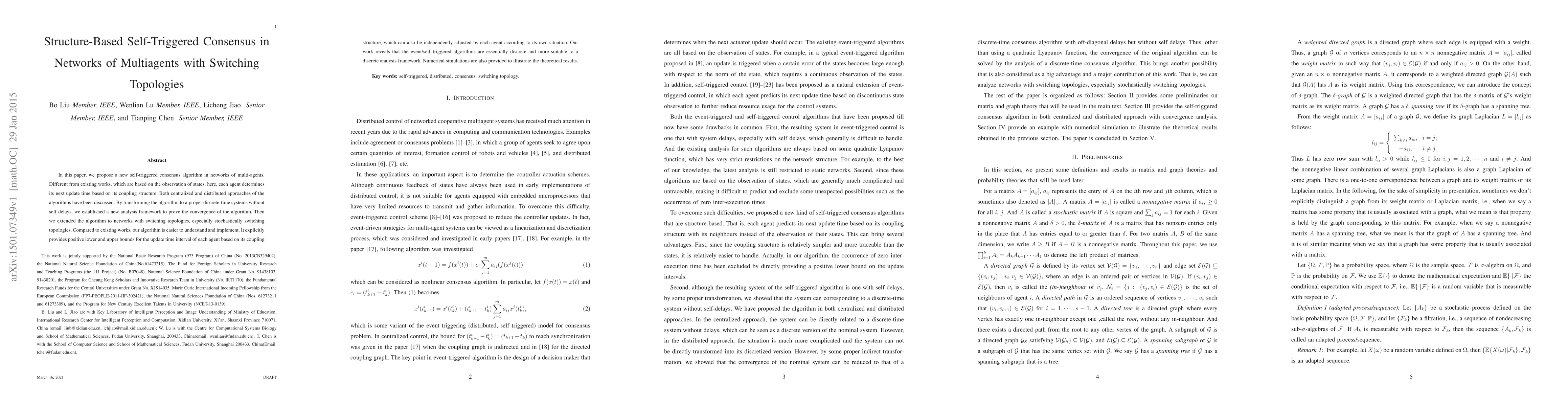 In this paper, we propose a new self-triggered consensus algorithm in networks of multi-agents. Different from existing works, which are based on the observation of states, here, each agent determines its next update time based on its coupling structure. Both centralized and distributed approaches of the algorithms have been discussed. By transforming the algorithm to a proper discrete-time systems without self delays, we established a new analysis framework to prove the convergence of the algorithm. Then we extended the algorithm to networks with switching topologies, especially stochastically switching topologies. Compared to existing works, our algorithm is easier to understand and implement. It explicitly provides positive lower and upper bounds for the update time interval of each agent based on its coupling structure, which can also be independently adjusted by each agent according to its own situation. Our work reveals that the event/self triggered algorithms are essentially discrete and more suitable to a discrete analysis framework. Numerical simulations are also provided to illustrate the theoretical results.