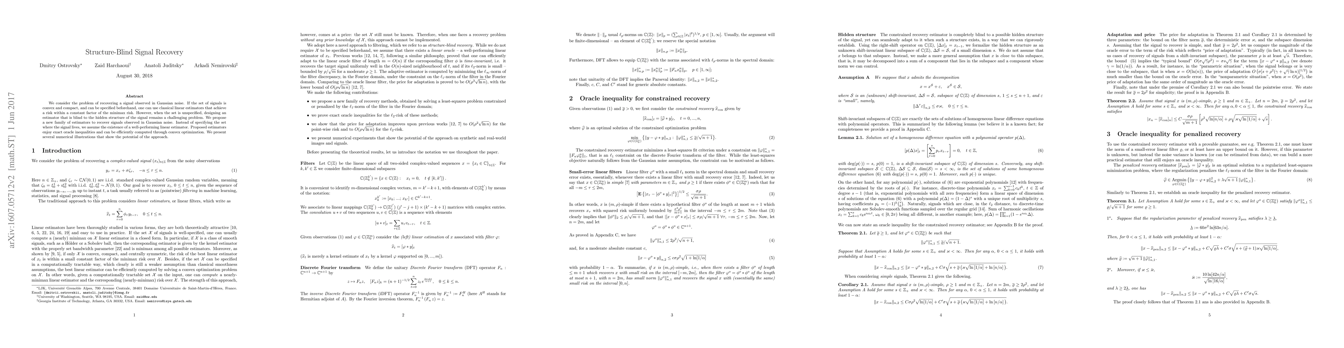We consider the problem of recovering a signal observed in Gaussian noise. If the set of signals is convex and compact, and can be specified beforehand, one can use classical linear estimators that achieve a risk within a constant factor of the minimax risk. However, when the set is unspecified, designing an estimator that is blind to the hidden structure of the signal remains a challenging problem. We propose a new family of estimators to recover signals observed in Gaussian noise. Instead of specifying the set where the signal lives, we assume the existence of a well-performing linear estimator. Proposed estimators enjoy exact oracle inequalities and can be efficiently computed through convex optimization. We present several numerical illustrations that show the potential of the approach.