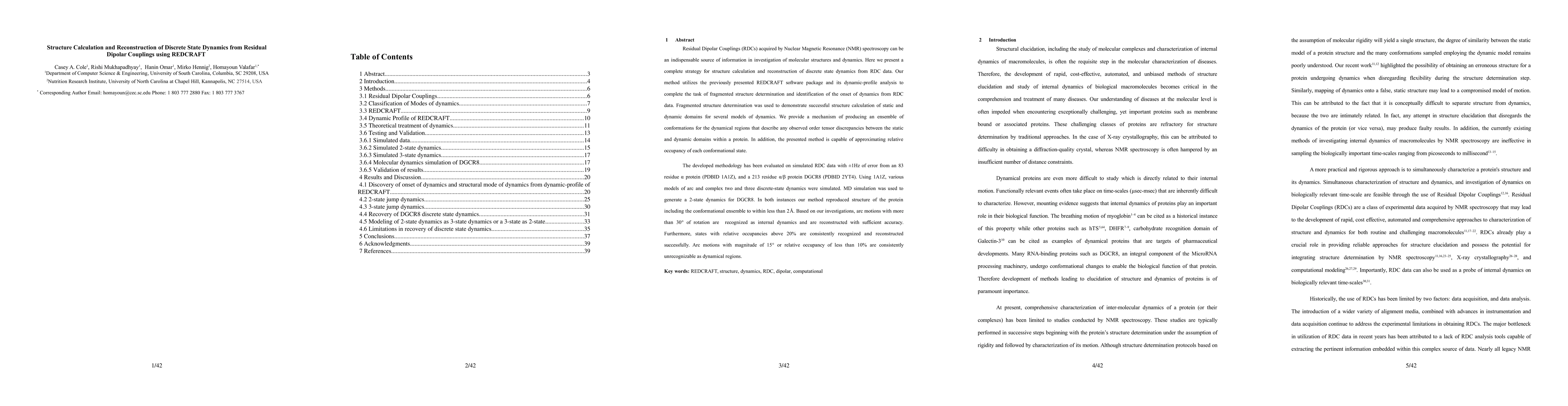 This paper presents a strategy for calculating molecular structures and reconstructing discrete state dynamics from Residual Dipolar Couplings (RDCs) using the REDCRAFT software. The method successfully determines fragmented structures and identifies dynamic domains, producing an ensemble of conformations that match observed order tensor discrepancies. The approach was validated on simulated RDC data, accurately reproducing protein structures and conformational ensembles.