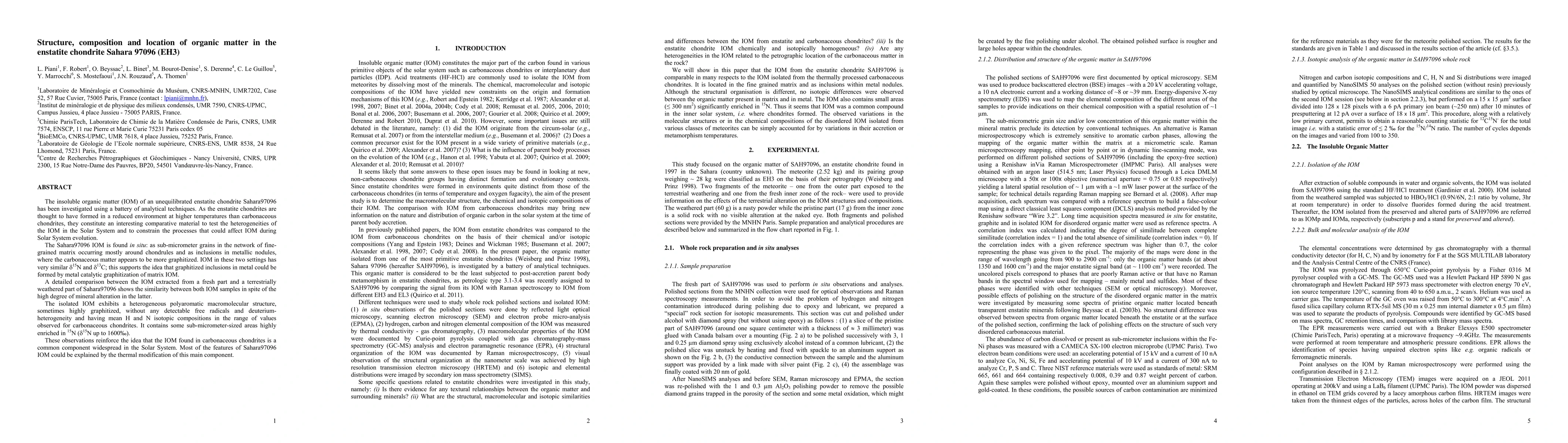 This paper investigates the structure, composition, and location of insoluble organic matter (IOM) in the enstatite chondrite Sahara 97096 (EH3), revealing its presence in submicrometer grains and metallic nodules. The IOM exhibits similar isotopic signatures and a heterogeneous polyaromatic structure, suggesting thermal modification of a common solar system component.