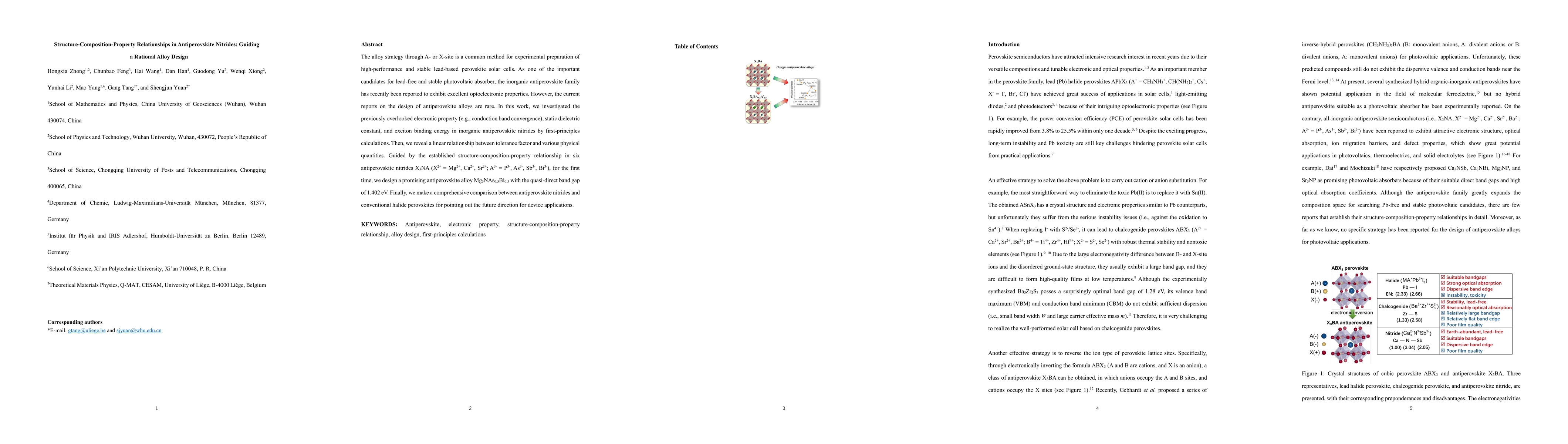The alloy strategy through A- or X-site is a common method for experimental preparation of high-performance and stable lead-based perovskite solar cells. As one of the important candidates for lead-free and stable photovoltaic absorber, the inorganic antiperovskite family has recently been reported to exhibit excellent optoelectronic properties. However, the current reports on the design of antiperovskite alloys are rare. In this work, we investigated the previously overlooked electronic property (e.g., conduction band convergence), static dielectric constant, and exciton binding energy in inorganic antiperovskite nitrides by first-principles calculations. Then, we reveal a linear relationship between tolerance factor and various physical quantities. Guided by the established structure-composition-property relationship in six antiperovskite nitrides X3NA (X2+ = Mg2+, Ca2+, Sr2+; A3- = P3-, As3-, Sb3-, Bi3-), for the first time, we design a promising antiperovskite alloy Mg3NAs0.5Bi0.5 with the quasi-direct band gap of 1.402 eV. Finally, we make a comprehensive comparison between antiperovskite nitrides and conventional halide perovskites for pointing out the future direction for device applications.