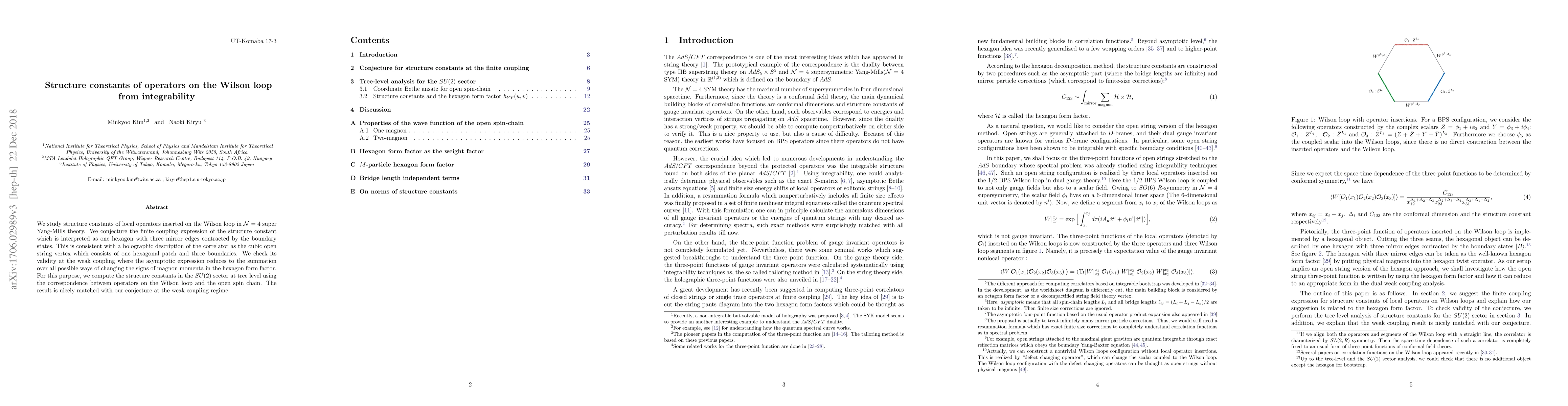We study structure constants of local operators inserted on the Wilson loop in ${\cal N}=4$ super Yang-Mills theory. We compute the structure constants in the SU(2) sector at tree level using the correspondence between operators on the Wilson loop and the open spin chain. The results are interpreted as the summation over all possible ways of changing the signs of magnon momenta in the hexagon form factors. This is consistent with a holographic description of the correlator as the cubic open string vertex, which consists of one hexagonal patch and three boundaries. We then conjecture that a similar expression should hold also at finite coupling.