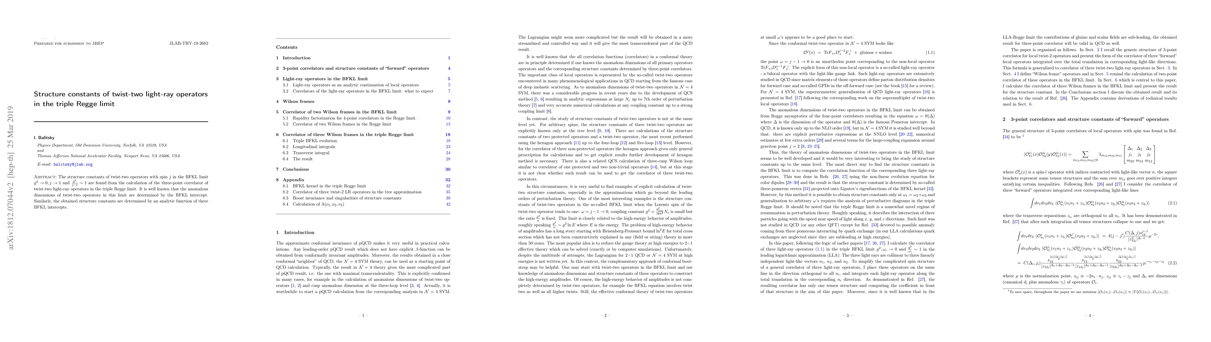 The structure constants of twist-two operators with spin $j$ in the BFKL limit $g^2\rightarrow 0, j\rightarrow 1$ but ${g^2\over j-1}\sim 1$ are determined from the calculation of the three-point correlator of twist-two light-ray operators in the triple Regge limit. It is well known that the anomalous dimensions of twist-two operators in this limit are determined by the BFKL intercept. Similarly, the obtained structure constants are determined by an analytic function of three BFKL intercepts.